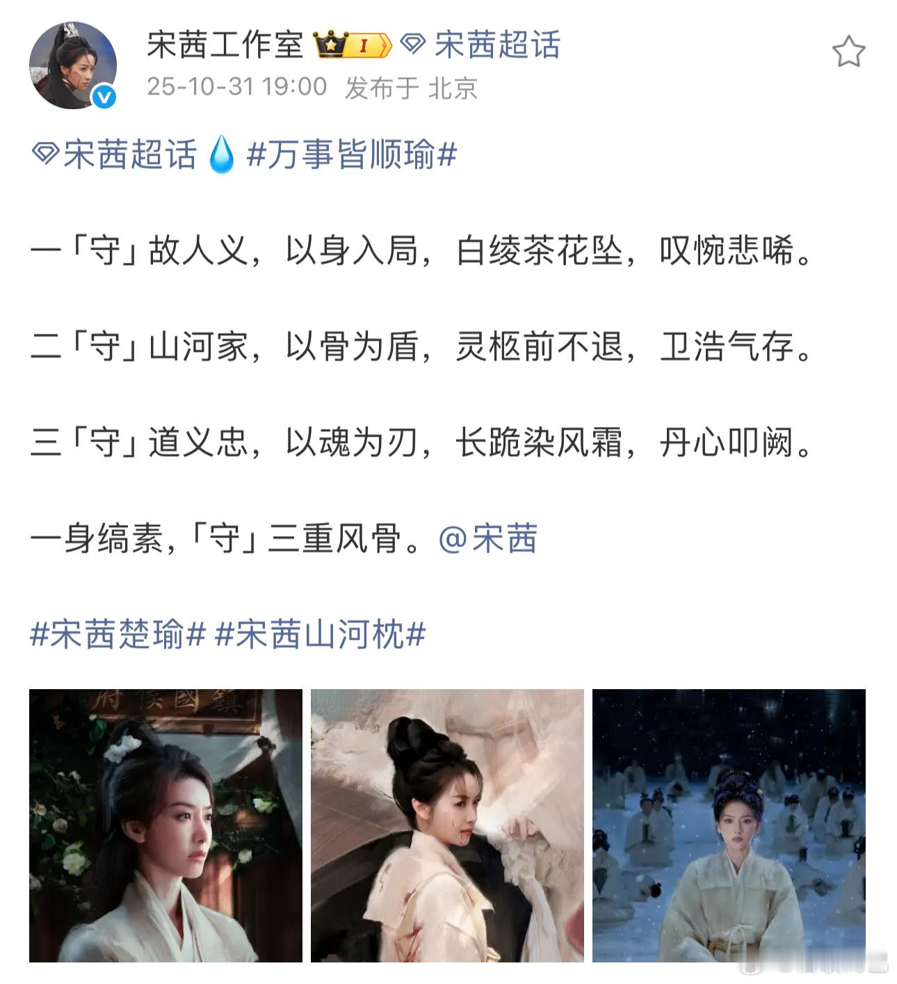 宋茜丁禹兮雪地撑伞名场面 茜室这组海报文案和今晚的剧情氛围好贴啊……书里让人飙泪的名场面,缟素风寒,长跪三天三夜只为三个「守」,坚韧向上的楚瑜,谁能不为这个寒风中的楚瑜落泪😢
