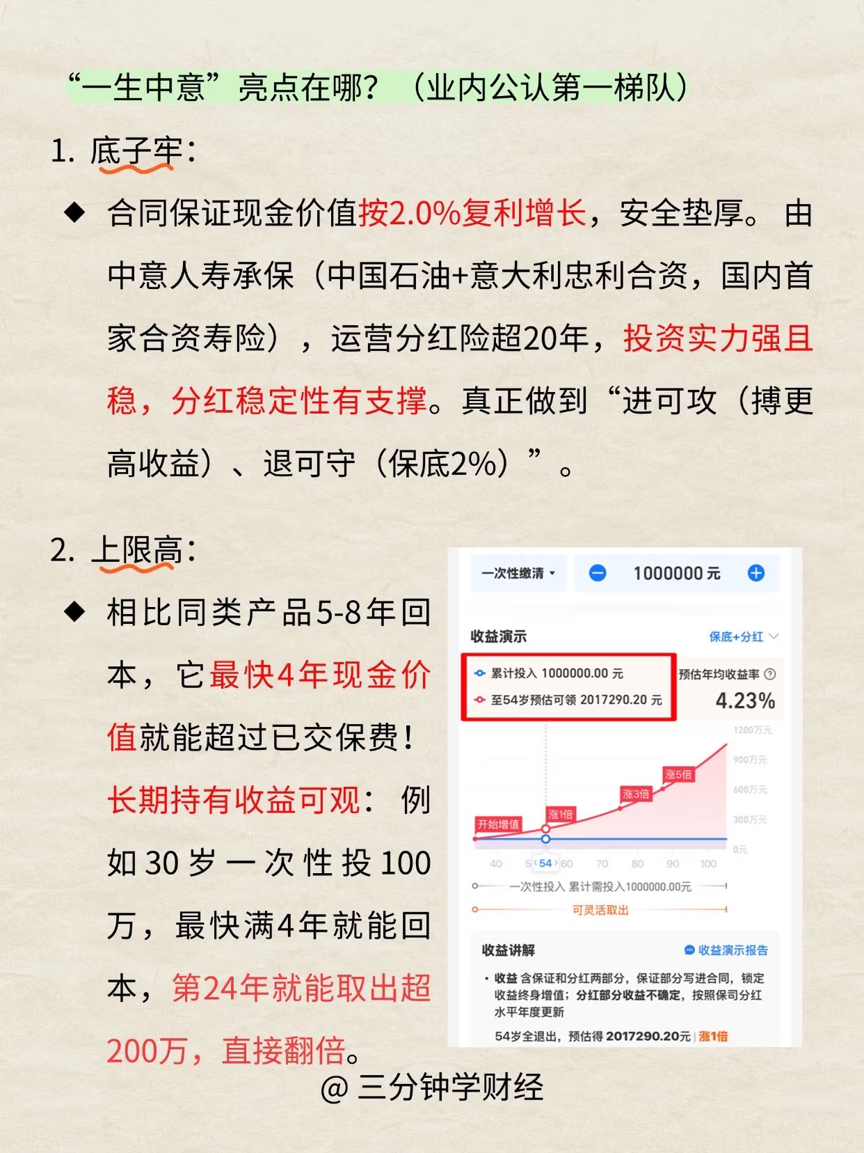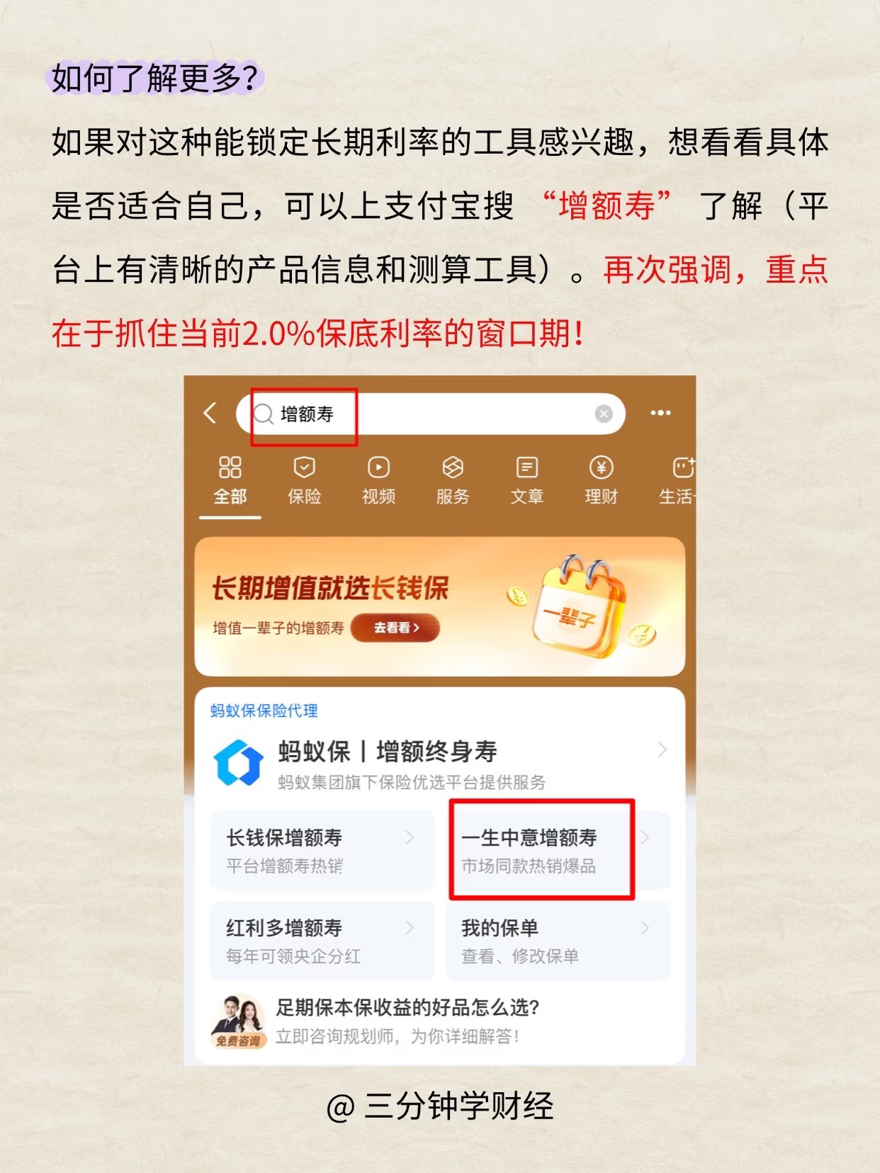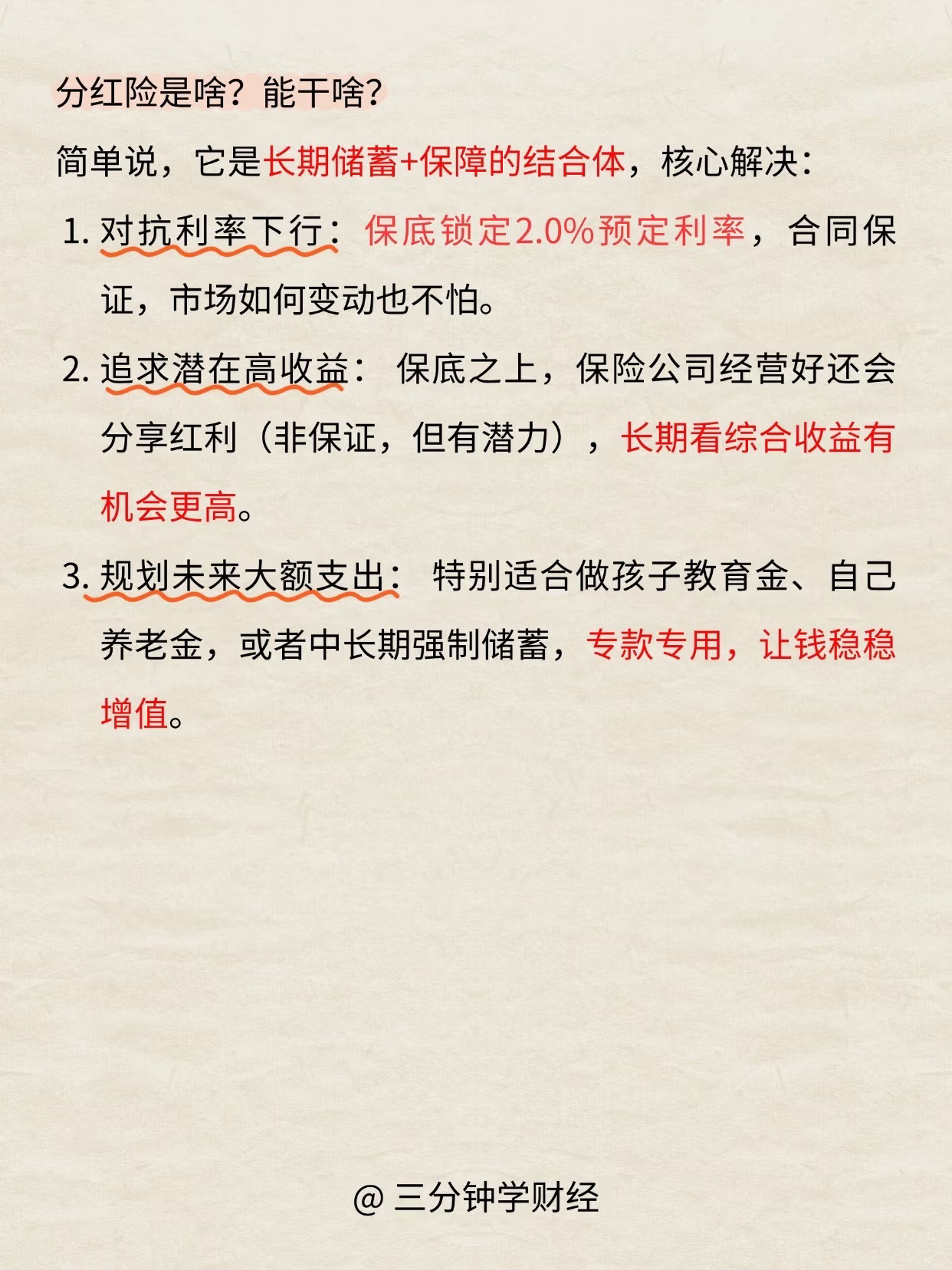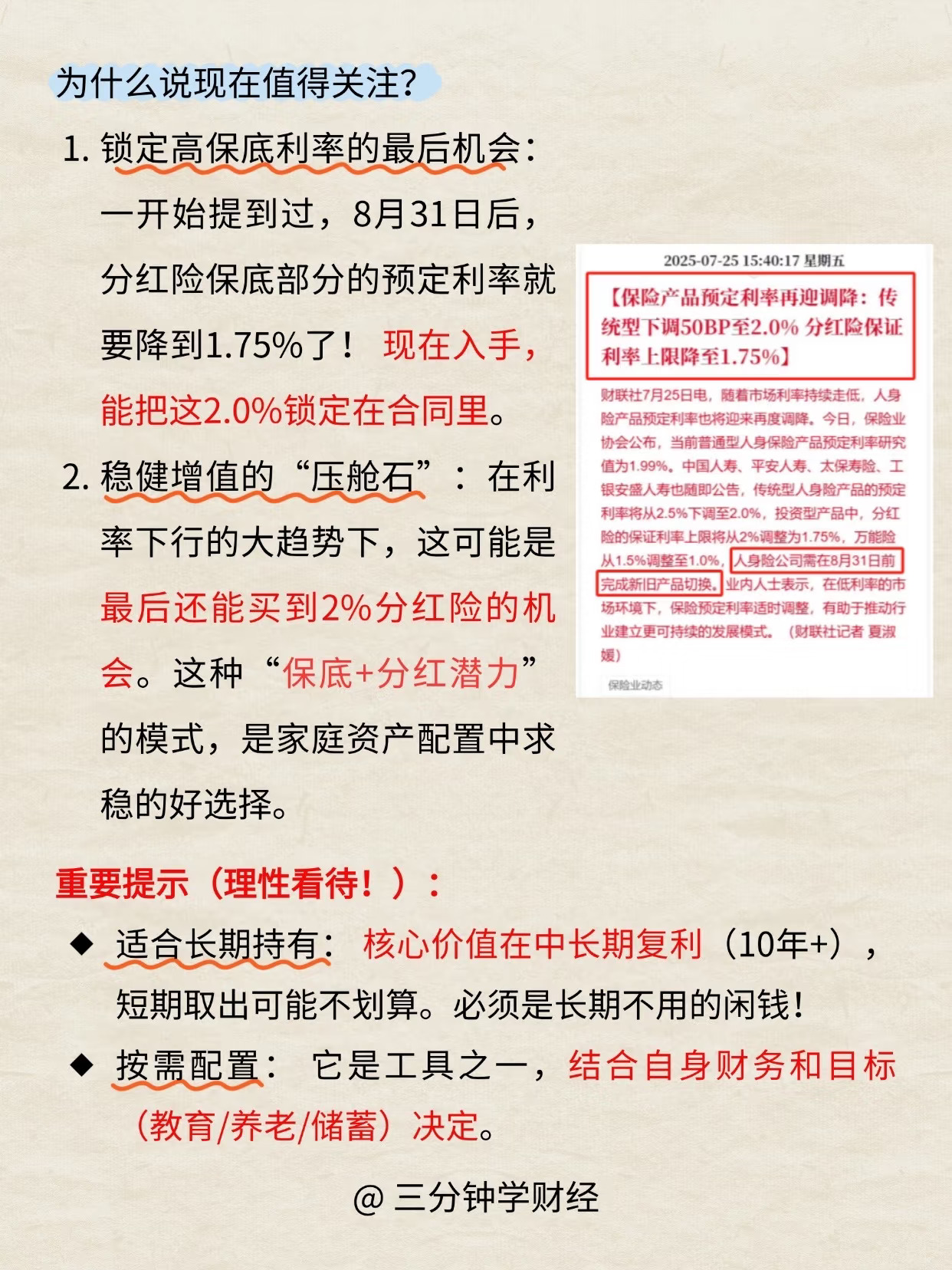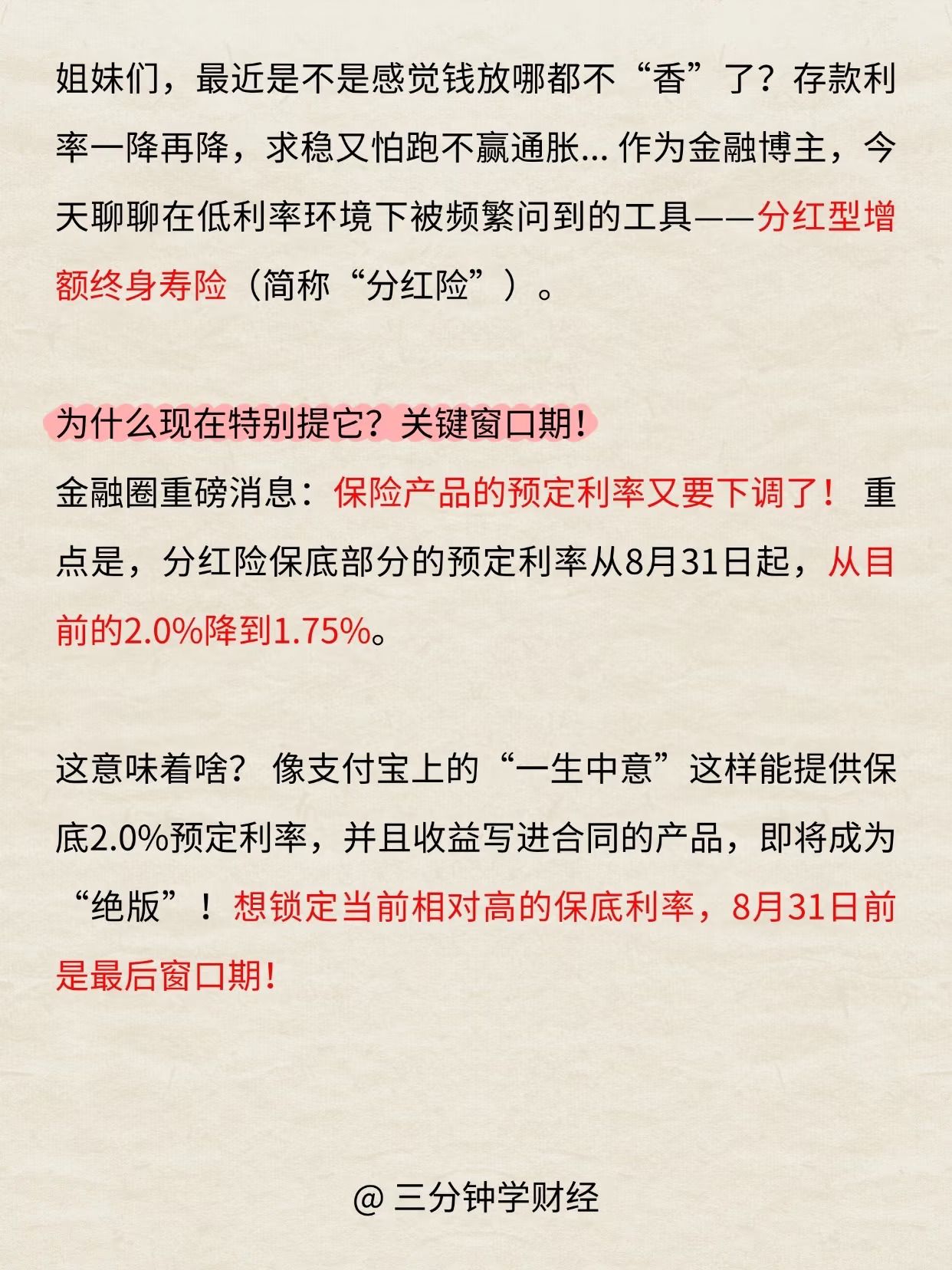 最近钱放哪都不“香”吧?在利率一路走低、通胀还在跑的现在,分红型增额终身寿险(简称“分红险”)成了稳健增值的新选择。 不仅保底部分还有2.0%的预定利率,这部分合同写死,只要现在买上,无论外部市场怎么变,它都不变,而在2.0%之上,还可以享受保险公司经营所带来的红利,两者叠加,进可攻退可守,长期持有还有机会实现收益翻倍! 现在为什么特别值得关注?因为8月31日后分红险保底部分的预定利率要降到1.75%,这几乎是当下你还能锁定2.0%分红险的最后窗口期。想知道自己到底合不合适入手?这期内容告诉你答案!本产品由中意人寿保险有限公司承保,具体费率及保单金额以实际为准,投资有风险,选择需谨慎,风险责任由购买者自行承担。