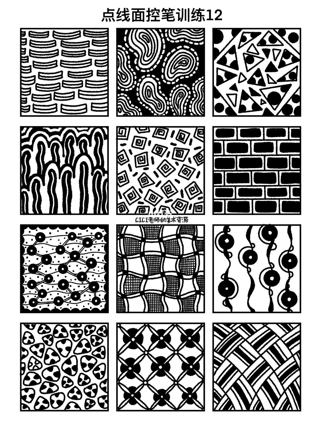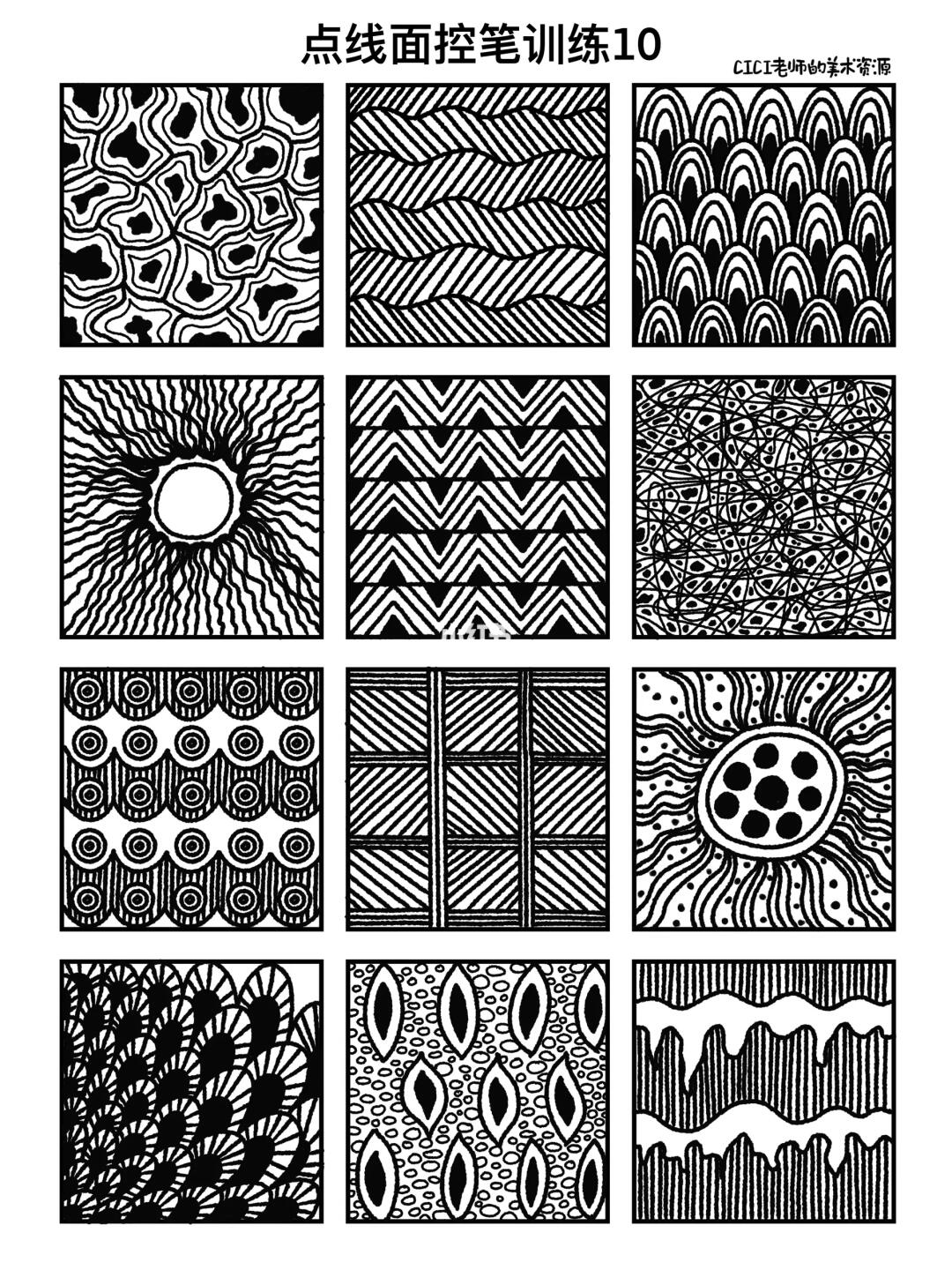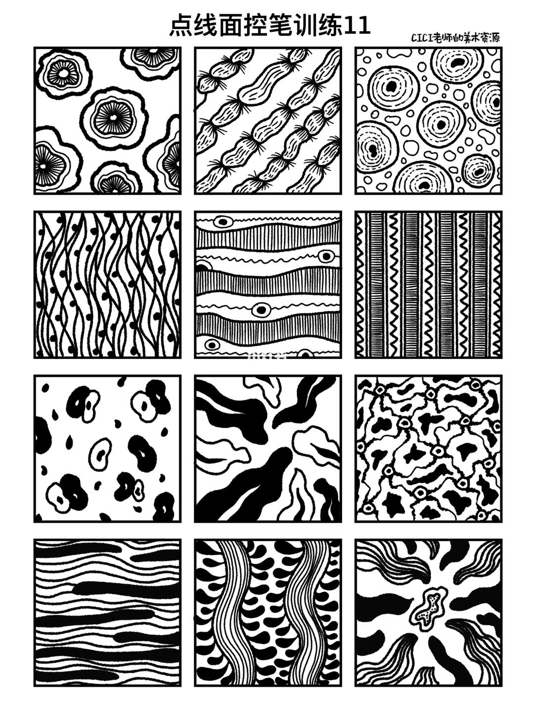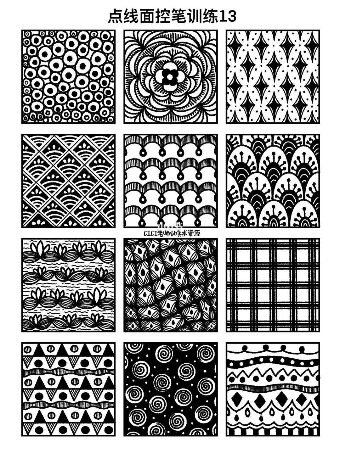 🔸从零基础开始控笔训练,一起来画画打卡吧! 黑白线描装饰画花纹,手绘练习必备临摹卡, 这个系列是点线面三元素花纹的积累。 🎨这些素材适用于,与点线面装饰画相关的美术课程: - 人教版美术一上第3课《彩线连彩点》 -人教版一下第3课《花地毯》 -人教版一下第4课《分一分 变一变》 -人教版一下第6课《摸一摸 画一画》 -人教版二上第10课《画出你的想象》 -人教版二下第3课《点、线、面》 -人教版二下第4课《漂亮的包装纸》 -人教版二下第5课《五味瓶》 -人教版二下第8课《叶子上的小血管》 -人教版三上第2课《万花筒》 -人教版三下第5课《感受音乐》 -人教版三下第11课《动物的花衣裳》 -人教版四上第4课《生活中的线条》 -人教版四上第5课《节奏的美感》 -人教版四下第2课《点的魅力》 -人教版五下第1课《形的魅力》 -人教版六上第4课《线与造型》 -人美版一下第4课《我们身边的线条》 -人美版二上第1课《会变的线条》 -人美版二下第4课《绘画游戏》 -浙美版一上《美术万花筒》 -浙美版一上第17课《动物身上的斑点》 -浙美版四下第14课《线条的魅力》 👩‍🎨备注:不是原创,大部分临摹教材、网图和的大佬们,小部分有改动。 📔篇幅太多,这里就不一一圈了,大部分找不到作者是谁,💃找得到的前面的笔记文案有圈原作者哦。 🈲️商用勿转载,仅供学习参考,🎨临摹请注明出处并