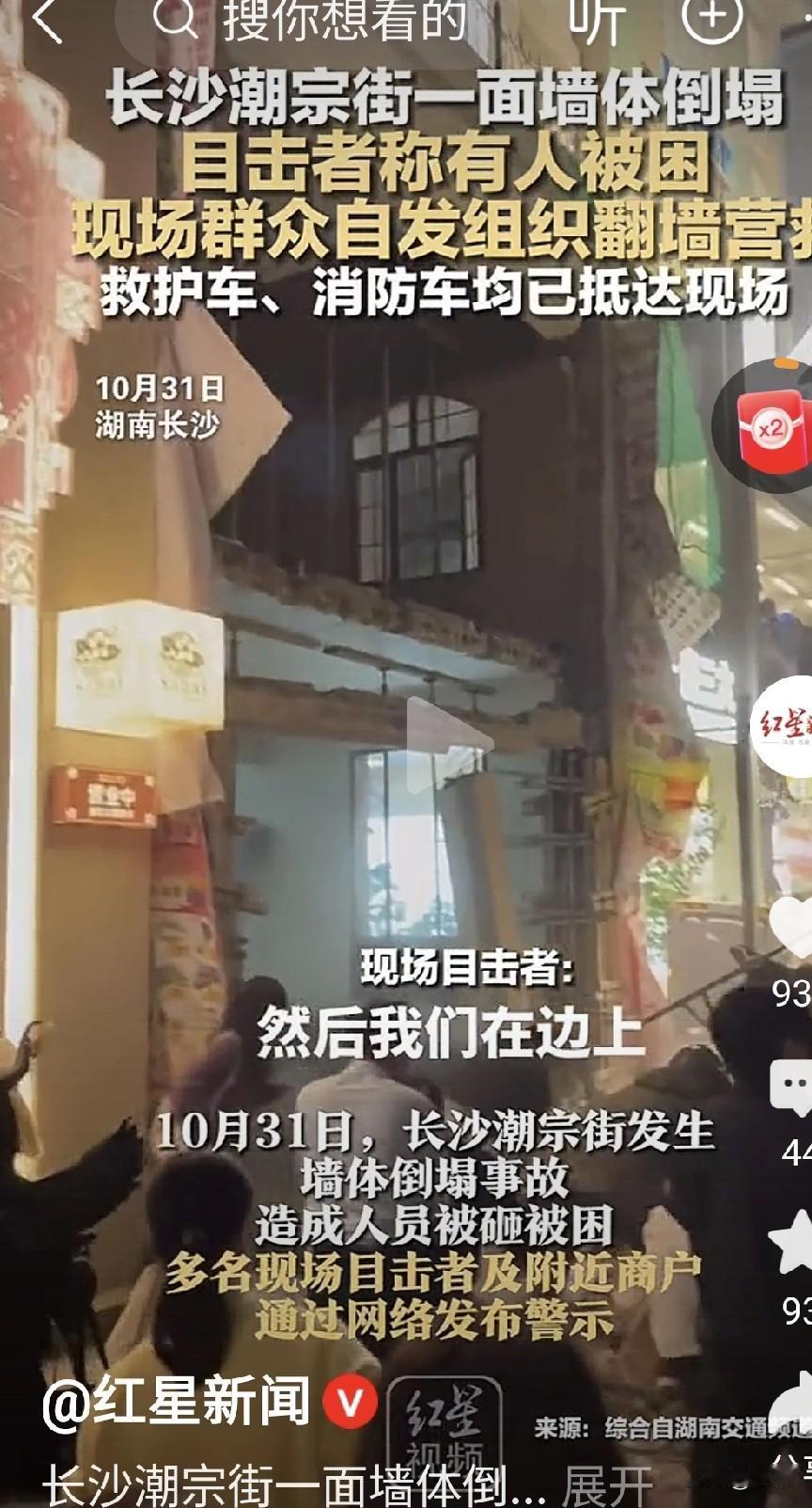 早上醒来看到到湖南长沙潮宗街墙体倒塌的消息, 真是好震惊啊! 昨晚8点左右,开福区通泰街街道一店铺,外墙塌了, 临时搭建的脚手架局部垮塌。 还有人被砸伤,被困…… 很快,120急救车 消防车🚒都到了。 很多热心路人赶紧过来帮忙,抬起脚手架和碎石救伤员。 真是不错,救援快。 后来开福区应急管理局通报,被困4名伤者都送医了, 目前后续处置和事故原因调查在进行。 多家媒体对此事进行了报道。真心希望伤者都能平安无事,能尽快查明事故原因,防止类似事件再次发生。 真是安全无小事! 围墙倒塌事故 脚手架倒塌事故 湖南自建房倒塌 长沙自建房倒塌