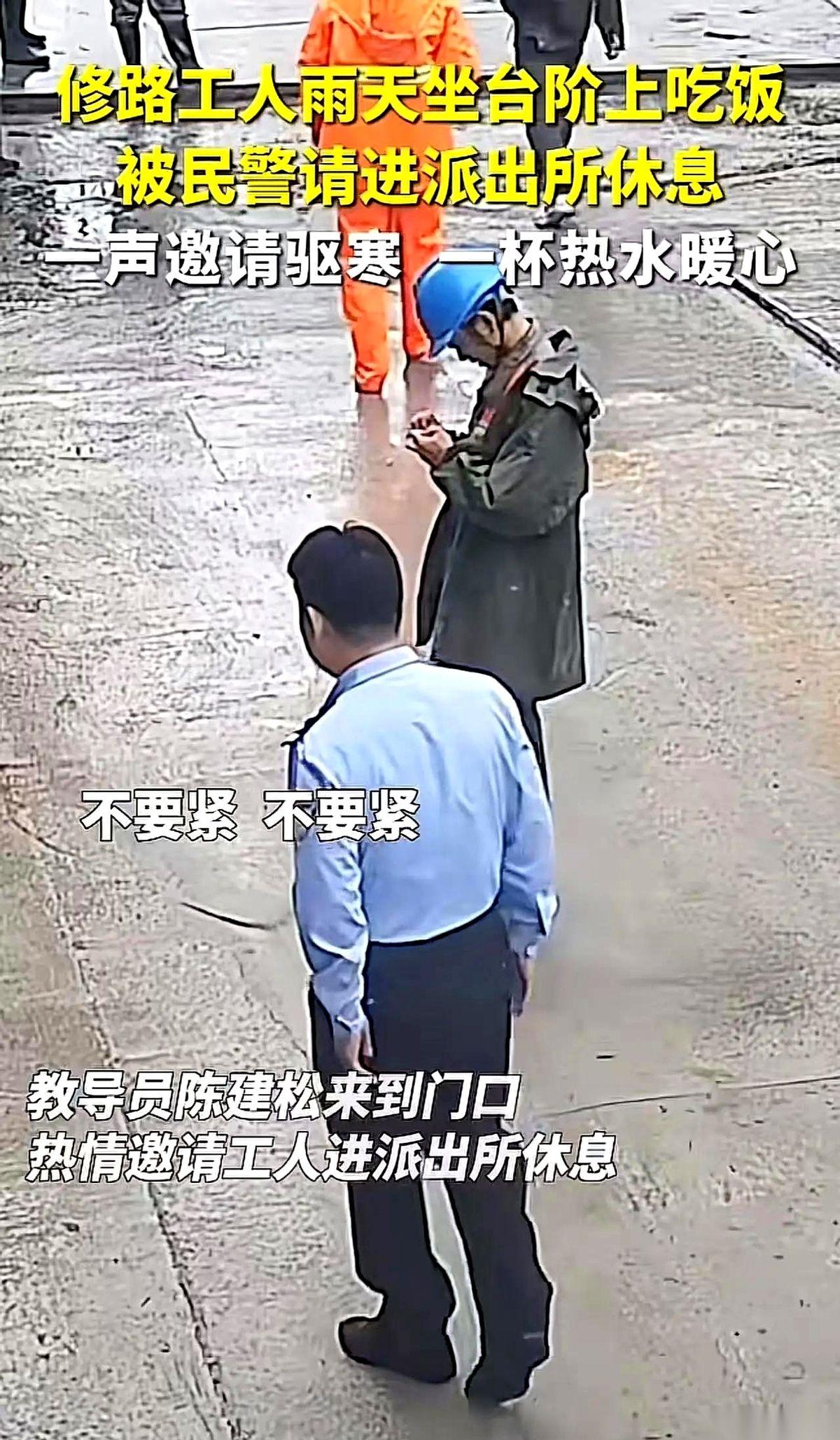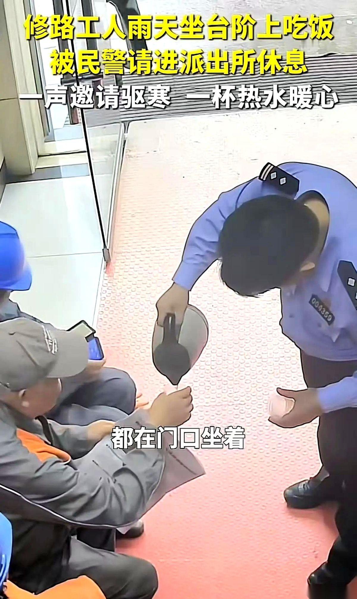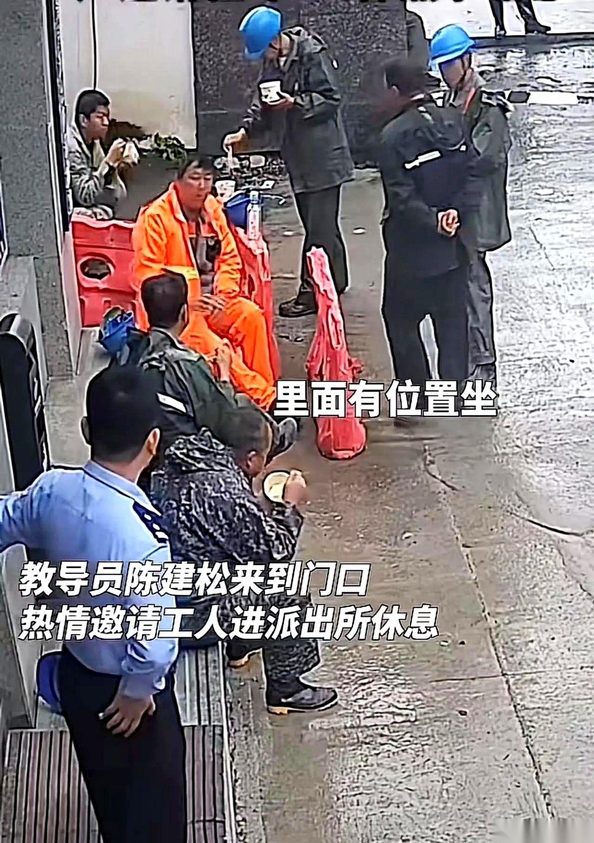 “全部进来!” 这一嗓子,吼得我心里咯噔一下。 一群修路的师傅,下雨天,没地方吃饭,就缩在派出所的屋檐下,蹲在台阶上,一人捧个盒饭。 他们怕啊。怕自己身上又是泥又是灰的,把人家干净地儿给弄脏了,怕给人添麻烦。 所以就那么小心翼翼地,恨不得把自己缩成一团,赶紧扒拉完饭就走人。 你知道最扎我心的是什么吗? 是民警吼完之后,师傅们那个迟疑、局促的反应。是那种下意识攥紧衣角,想进去又不敢进去的卑微感。 我的天,这得是多深的自我规训,才会连躲个雨都觉得是在打扰别人。 还好,那声“全部进来!”不是商量,是命令。 那句“看着你们在门口,我心里不舒服!”,这句话的分量,比一百句“欢迎光临”都重。 他不是在施舍,他是在说:你们这样辛苦,不该受这份委屈。我,一个穿着这身制服的人,看不下去。 这跟什么高大上的道理都没关系。 这就是一个普通人,对另一群普通人的体恤和尊重。是一种本能的“不落忍”。 一杯热水,暖的是胃。 但这一声吼,给的是体面。 希望咱们这个社会,能有越来越多这样“看不下去”的吼声。让每个靠双手吃饭的人,都能在风雨来临时,有个理直气壮的去处。