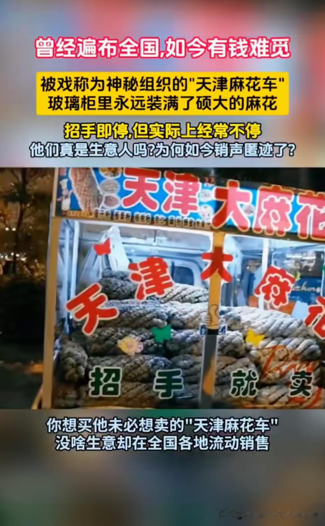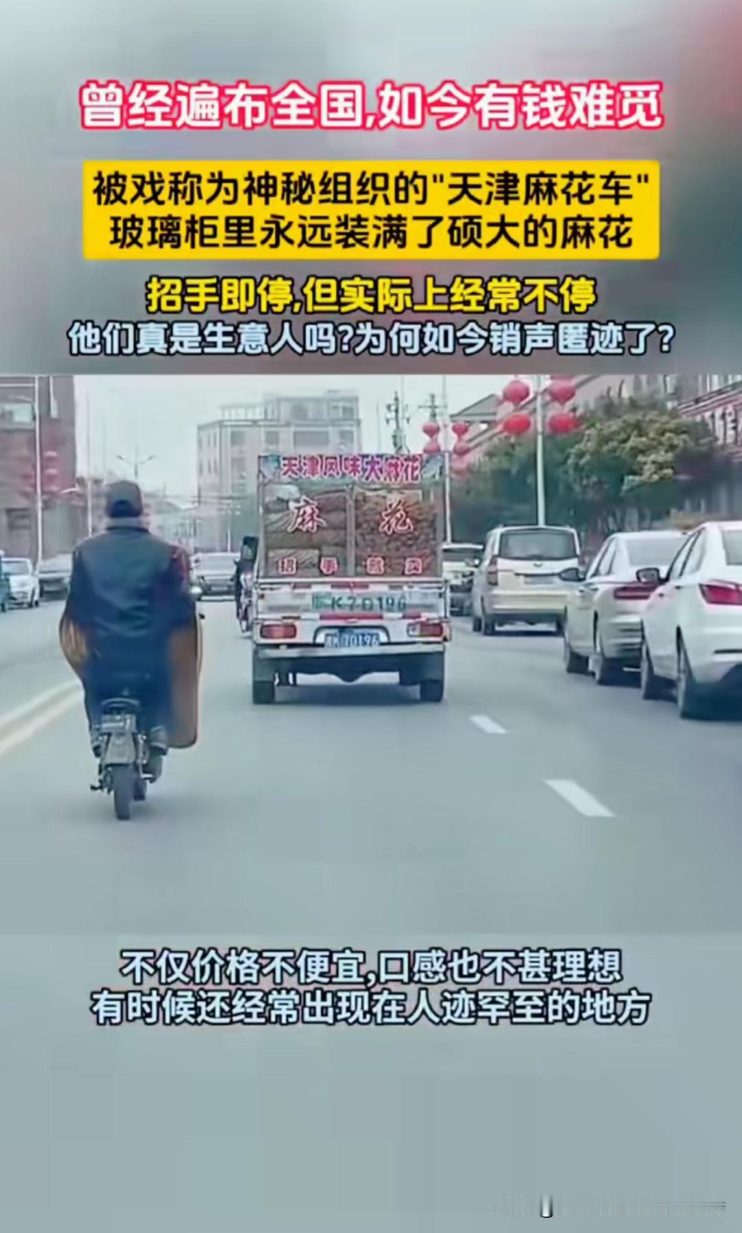 以前满大街跑的天津大麻花车现在少见了,这现象挺有意思。曾经那些号称天津特产大麻花的小货车,到处乱窜却鲜有人买。很多所谓天津大麻花车其实来自安徽,大家都好奇它们靠啥赚钱。网上传言更是离谱,有人说它们是间谍组织,到处跑为了绘制地图、传递情报;还有人说专门拐卖小孩。 不过现在这些车不见了,或许是大家觉悟提高,都不买高价货,让他们没了市场。那些四处游荡高价卖货的,说不定真有不可告人的秘密。没有市场,自然就消失咯。