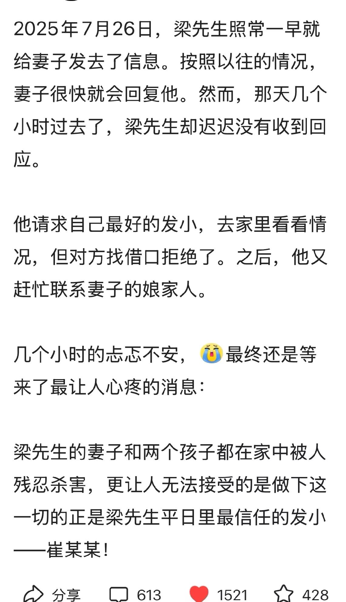 杀害母子三人的崔路路,吊梢眼、鹰钩鼻,两腮无肉,一副狠人的模样!他的家里已经没什么人了,干了这样丧良心的事儿,家人估计无颜面对乡亲父老,不然在这个村子让人戳一辈子脊梁骨… 被害一家,妻子漂亮体贴、儿子活泼懂事,女儿乖巧伶俐,没想到遇到这么一个白眼狼,真是倒了八辈子血霉! 这个崔路路不仅毫无感恩之心,还对发小的妻儿毫不留情,痛下狠手,一下毁了好几个家庭… 最可怜梁先生,如今天人永隔,闭上眼睛就是母子三人,让人痛彻心扉! 三人的坟墓挨在一起,梁先生经常去看望他们,带去孩子们喜欢的零食,但再也不能和妻子孩子们相见了, 愿他们在天堂安好,两个孩子能够快快乐乐的…