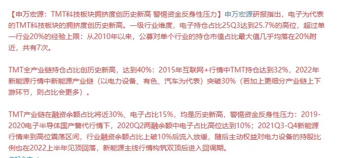 第二,券商开始看空TMT,电子,通信方向。申万宏源:TMT科技板块拥挤度创历史新高,TMT全产业链持仓占比创历史新高,达到40%,警惕资金反身性压力!