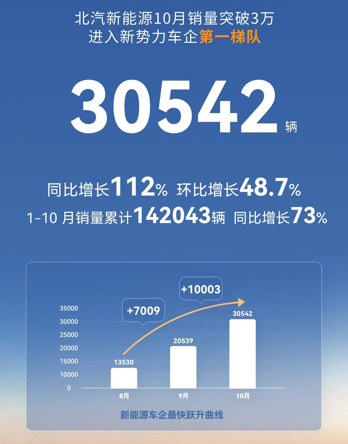 日前,北汽新能源官宣:今年前10个月,累计销量达14.2万辆,同比增长73%。其中,10月销量突破30542辆,同比增长112%,进入新势力车企第一梯队。具体来看,享界品牌单月销量6700辆,极狐品牌单月销量23387辆。在享界+极狐双品牌战略下,北汽新能源展现出了强劲的向上态势。
