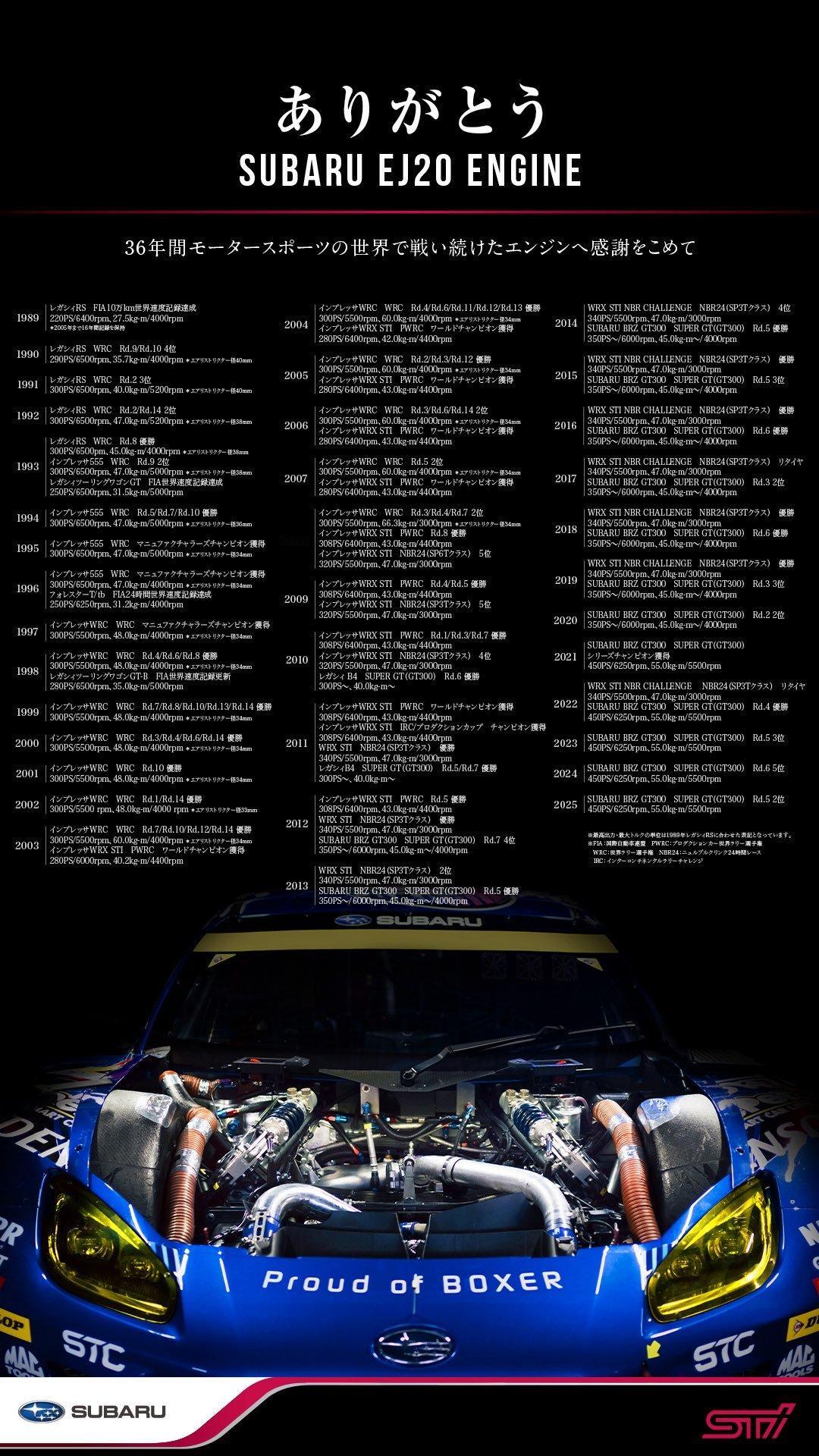 这个周末举行的Super GT茂木300公里大赛将是斯巴鲁EJ20引擎的最后一舞,官方特意给大家制作了这张海报,记录了过去36年间这款一代名机在赛车运动中给大家留下的种种回忆……