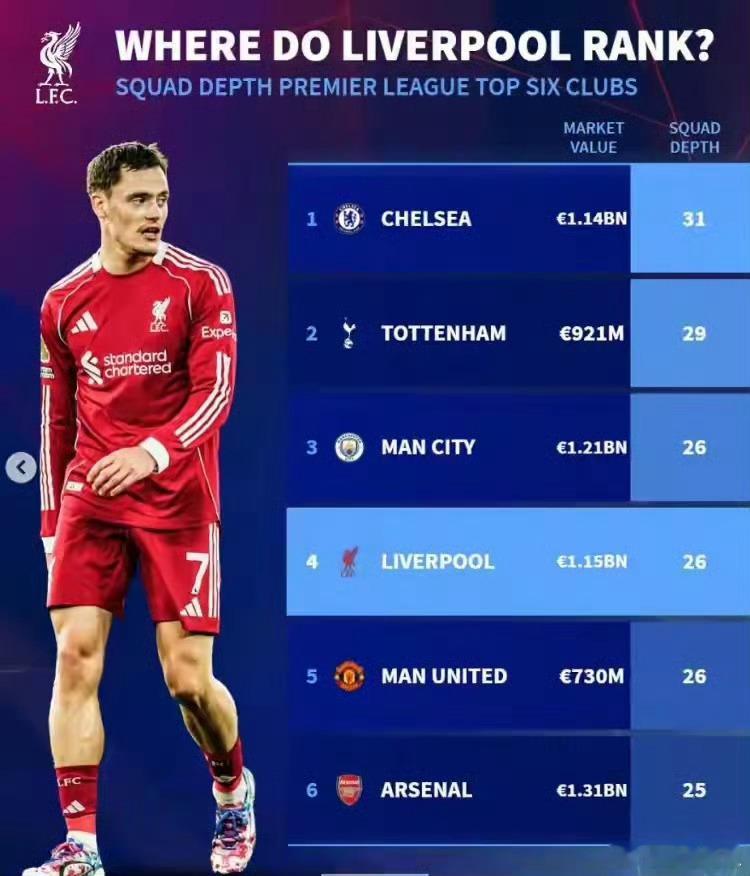 4. 利物浦:26人,总身价11.5亿欧元