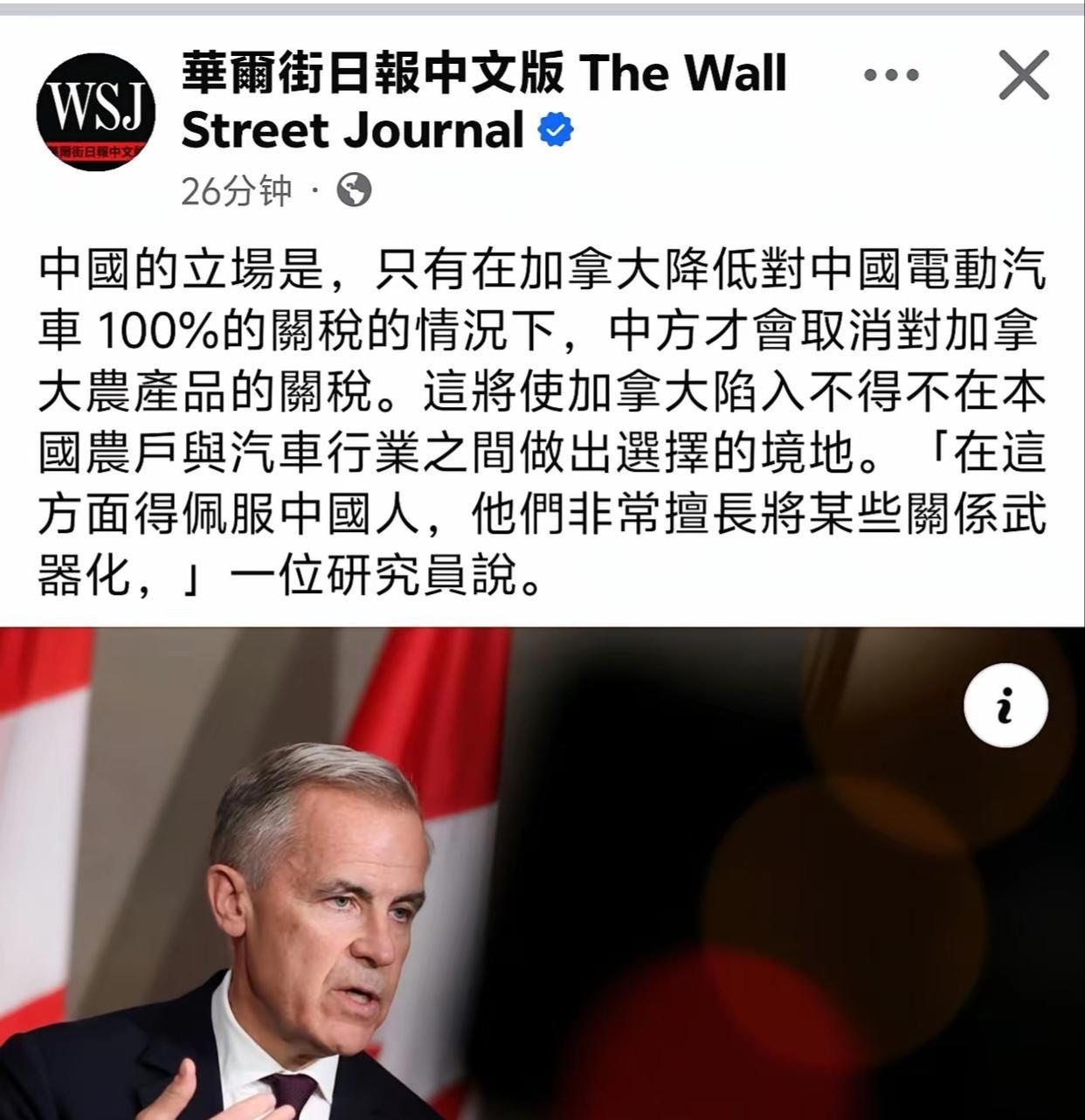 美媒:非常佩服中国人,他们非常擅长将某些关系“武器化” 近日,美国华尔街日报中文网报道:“中国的立场是,只有加拿降低对中国电动汽车100%关税的情况下,中方才会取消对加拿大农产品的关税。这使加拿大陷入不得不在本国农产品与汽车行业做出选择的境地。[在这方面得佩服中国人,他们非常擅长将某些关系武器化]一位研究员说”。 美媒把中国要求加拿大先取消无理强加对中国电动汽车关税,中国再取消对加拿大农产品关税称之为“将某些关系武器化”,简直就是颠倒黑白、倒打一耙抹黑中国的行为。 中国对外贸易关系向来遵守规则、讲原则,并要求双方做到公平、公正,相互尊重、互利共赢。华尔街日报要搞清楚加拿大是首先为讨好美国、单方面无理发动对中国电动汽车强加关税,中国被迫“对待原则”才对加拿大加征农业关税进行强力反制的。然而,“解铃还须系铃者”,要中国取消对加拿大农业关税,当然加拿大必须首先要取消强加给中国电动汽车关税。中国的这种做法可以说公平公正、合情合理合法,称中国这样做就成了“武器化”之说,纯属无稽之谈! 其实,西方国家能有这种想法,归根结底还是向来认为自己高人一等,心里优越感作怪,还总认为“我可以制裁你,你不能反制我”否则就不符合西方那套“规则”,已经是21世纪的今天还有这样的想法、真的太天真幼稚了。还是那句话,今天的中国已经不是昔日之中国,想做损害中国企业发展利益的行为,自己又不受任何伤害影响,已经不太现实了。