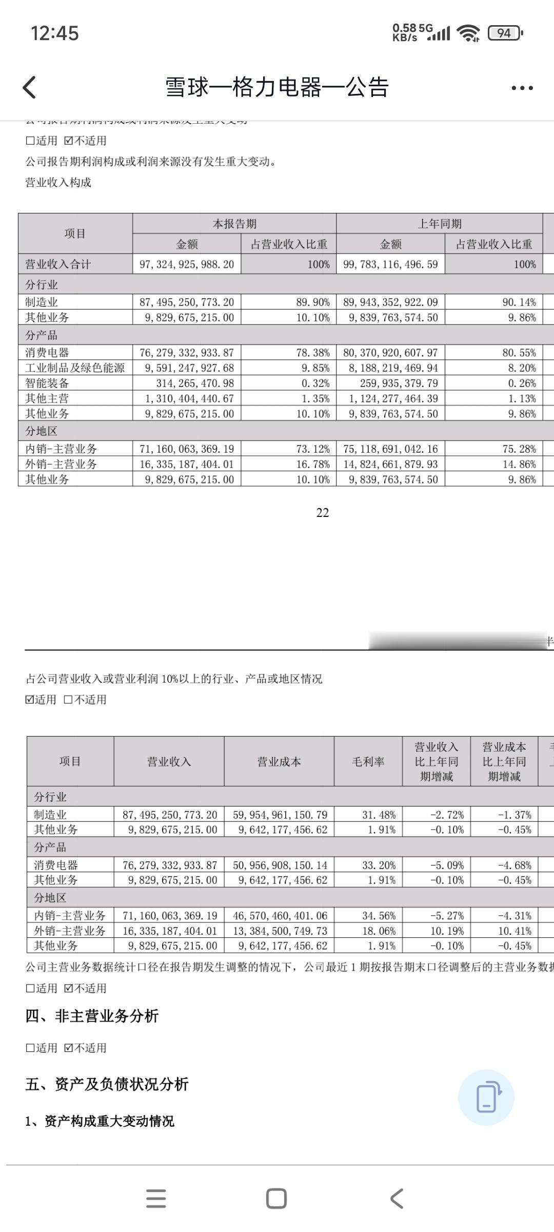 有时候真搞不懂格力电器的那些铁粉,他们怎么就那么轻易相信小作文呢? 什么格力又是搞芯片,又是搞机床的,什么工业母机,掌握了核心竞争力,得了国际大金奖... 他们就是不愿意仔细的去看格力的财报,很多信息都会在财报上反馈出来,尤其是财务数据...这是很难骗人的! 格力的智能装备,占营收之比只有0.32%,什么概念呢,也就是上半年近一千亿的总营收,只有3亿来自智能装备,这3亿里面可能还不全是机床... 如果真的有竞争力,不应该是这个营业额的... 一句话,格力电器一直都在吃老本,空调业务占比太大了... 再说一句,格力电器在高瓴资本进来后,就已经不是地方国企了,股份占比最高的是高瓴资本,实际控制权则在老太太为首的管理层...