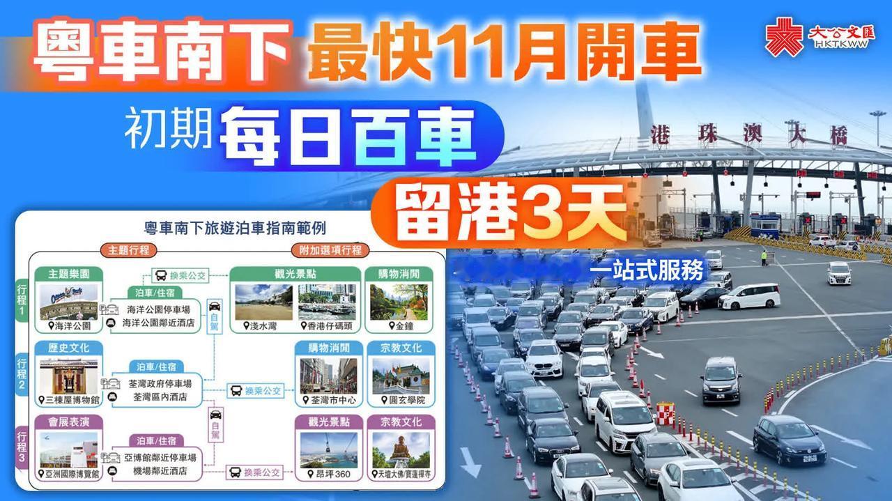 “粤车南下”政策正式公布啦,广东居民自驾去香港更方便了!这个政策分阶段推进,还有两种出行方式可选。 先划重点:首批开放广州、珠海、江门、中山这四个城市,半年后会推广到广东其他地市。关键时间记好啦:11月1日起能预约口岸停车位、报名市区通行抽签;11月15日就能把车停到口岸停车场;11月23日首批市区通行抽签,中签后12月9日提交申请,12月23日就能开车进香港市区,2026年中会全省推广。 两种出行方式按需选: 第一种是“口岸停车转机”——把车停在港珠澳大桥香港口岸的自动化停车场,之后坐机场接驳巴士去香港机场,或者转乘香港本地交通进市区,车不用进市区。11月1日9点起能在香港机场管理局官网预约车位,先到先得,11月15日就能用。 第二种是“驾车进香港市区”——得先抽签拿资格,11月1日9点到20日24点在“粤车南下”信息管理服务系统报名,中签后12月9日提交申请,12月23日就能开车经港珠澳大桥进市区。 申请进市区要满足这些条件:申请人得是年满18岁的广东车主,车辆是广东登记的、6米内8座及以下非营运小车;每车能备案2名驾驶人,都得有内地驾照和香港正式驾照。另外要注意,初期工作日每天限100辆车进市区,每次停留不能超3天,香港交通规则和内地不一样,一定要提前了解,别违法哦。 内地车出港澳 港澳车 香港开车攻略 粤车入港