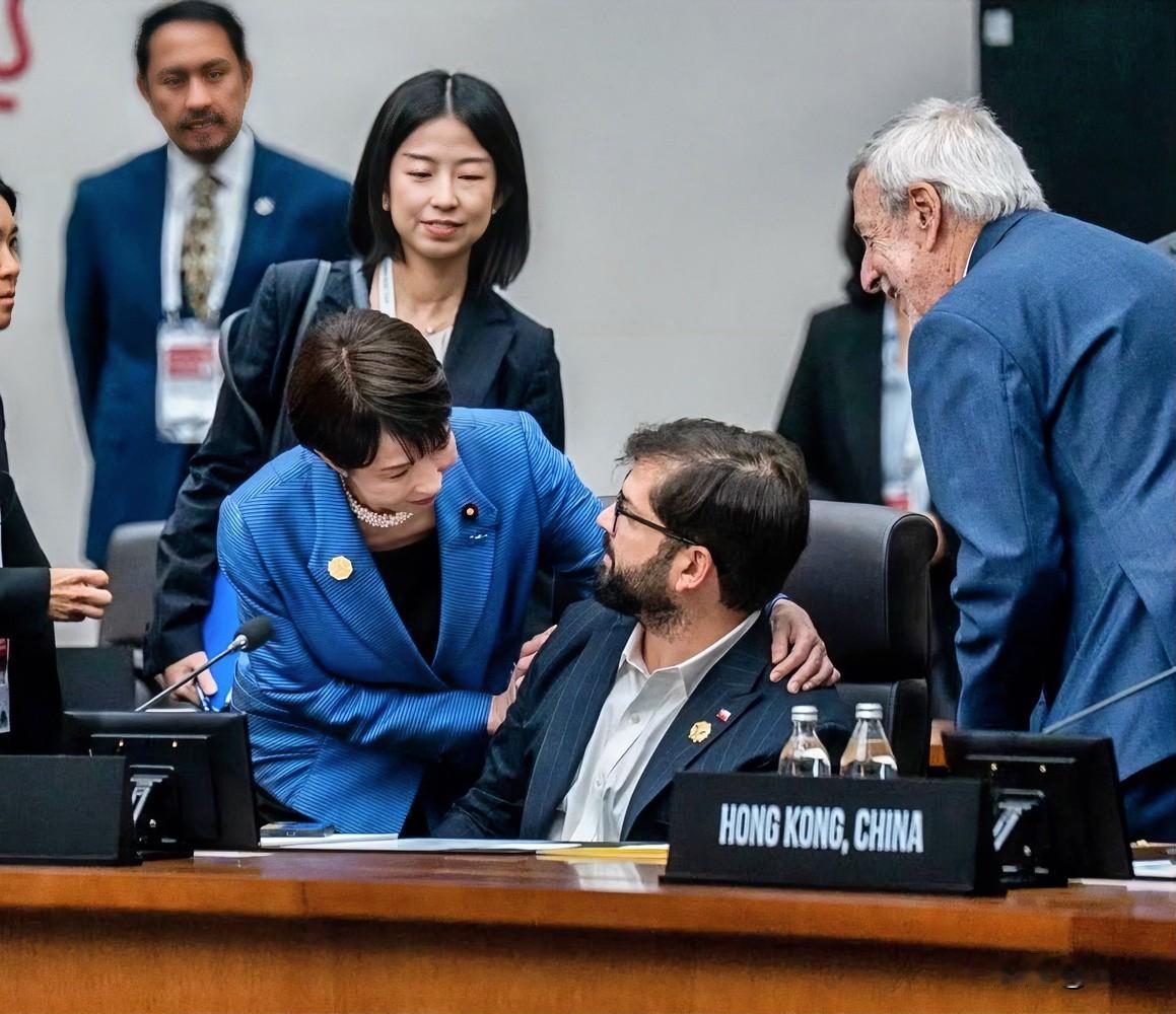 彻底放飞!日本女首相高市早苗过于热情、自来熟,结果把39岁的智利总统博里奇给吓了一跳。当地时间11月1日,现身韩国APEC峰会的日本首相高市早苗在会议间隙主动与智利总统互动,然而,高市早苗主动用手臂搭到智利总统博里奇肩膀的举动引发了巨大争议,毕竟,两人第一次见面,而且还是在如此重要的国际会议场合,更何况,从媒体曝光的整个过程不难看出,高市早苗的举动让博里奇也感到非常震惊,甚至是吓了一跳。然而,这已经不是高市早苗在韩国开会期间第一次这么没有边界感了,一天前,她把椅子滑到印尼总统身边主动与其攀谈的画面已经让外界“记忆犹新”,甚至有媒体认为高市早苗在会晤特朗普之后被指谄媚外交后,已经开始彻底放飞自我、故意以这种形象示人,以便淡化外界嘲讽她与特朗普进行“臣妾外交”、严重影响日本国际形象。
