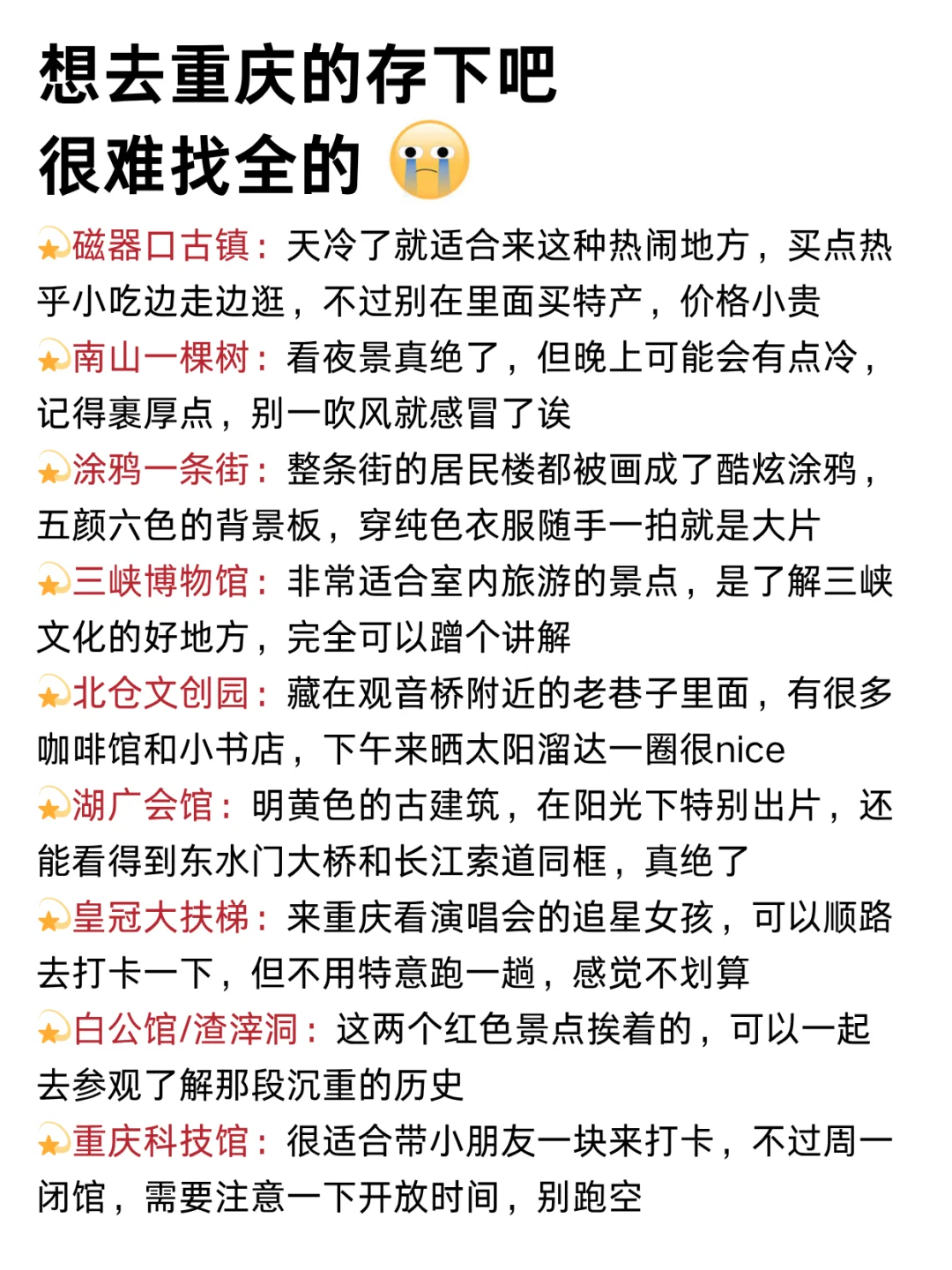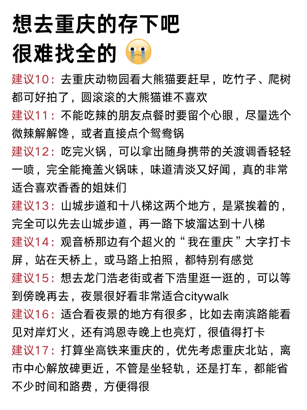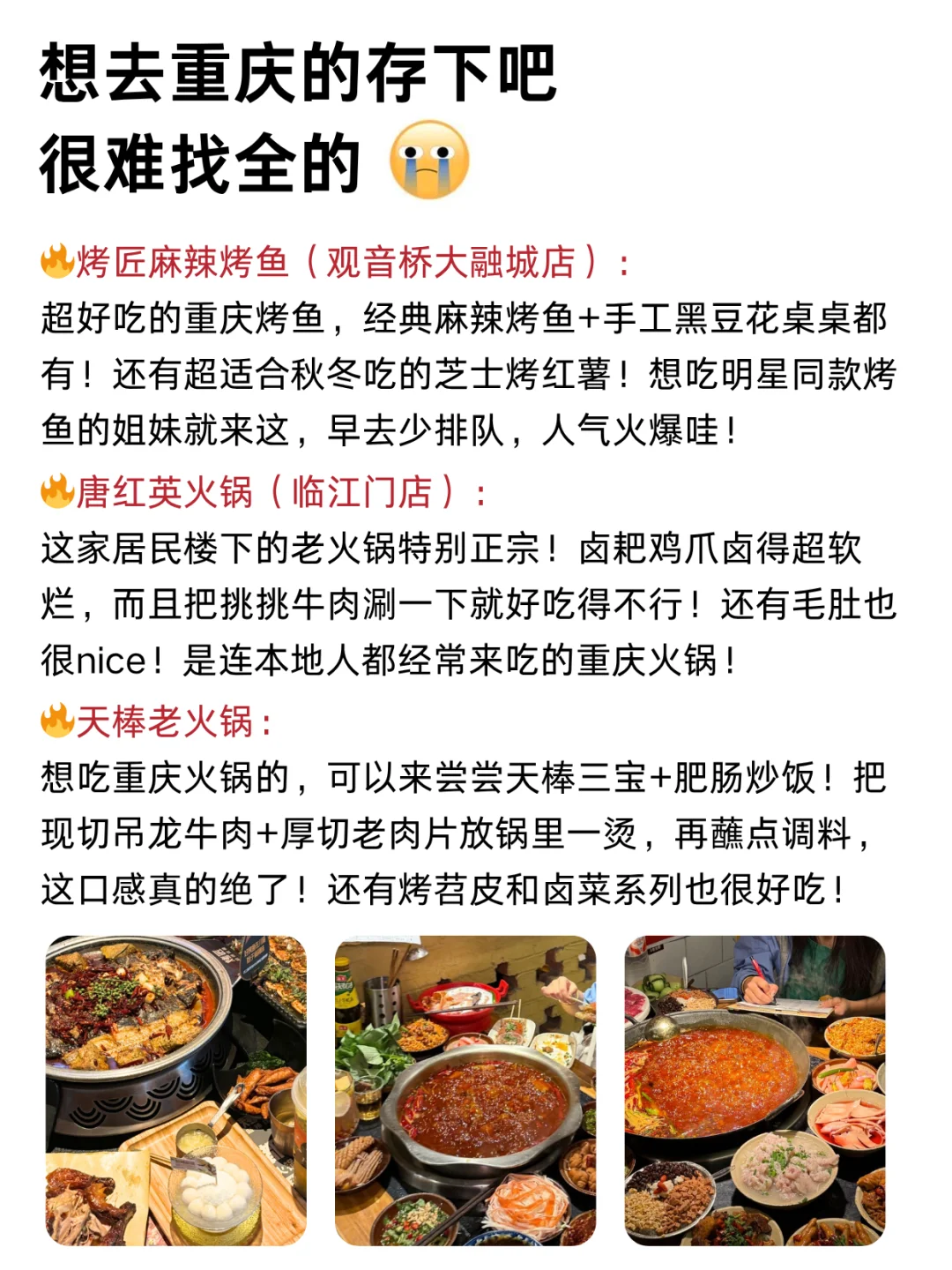 💡刚从重庆回来,用亲身经历给你划重点!11月12月天气转凉,玩法不一样,看完这篇直接抄作业✅ - 📝游玩指南 📍吃完火锅,可以拿出随身携带的关渡调香轻轻一喷,完全能掩盖火锅味,味道清淡又好闻,真的非常适合喜欢香香的姐妹们 📍去山城步道,可以坐轻轨到七星岗1号口,再到领事巷,这样全是下坡路,特别省力气 📍去重庆动物园看大熊猫要赶早,吃竹子、爬树都可好拍了,圆滚滚的大熊猫谁不喜欢 📍不能吃辣的朋友点餐时要留个心眼,尽量选个微辣解解馋,或者直接点个鸳鸯锅 📍头一次来重庆的宝子们,要记住在洪崖洞根本就没有“快速通道”,跟着指示牌排队进去更靠谱 - 🍱重庆美食 🔥烤匠麻辣烤鱼(观音桥大融城店):超好吃的重庆烤鱼,经典麻辣烤鱼+手工黑豆花桌桌都有!还有超适合秋冬吃的芝士烤红薯! 🔥唐红英火锅(临江门店):卤耙鸡爪卤得超软烂,把挑挑牛肉涮一下就好吃得不行!还有毛肚也很nice!是连本地人都经常来吃的重庆火锅! 🔥天棒老火锅:想吃重庆火锅的,可以来尝尝天棒三宝+肥肠炒饭!现切吊龙牛肉口感真的绝了!还有烤苕皮和卤菜系列也很好吃! 更多攻略查看