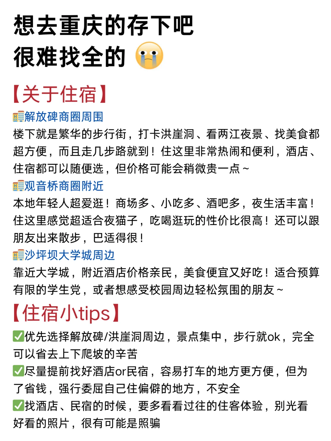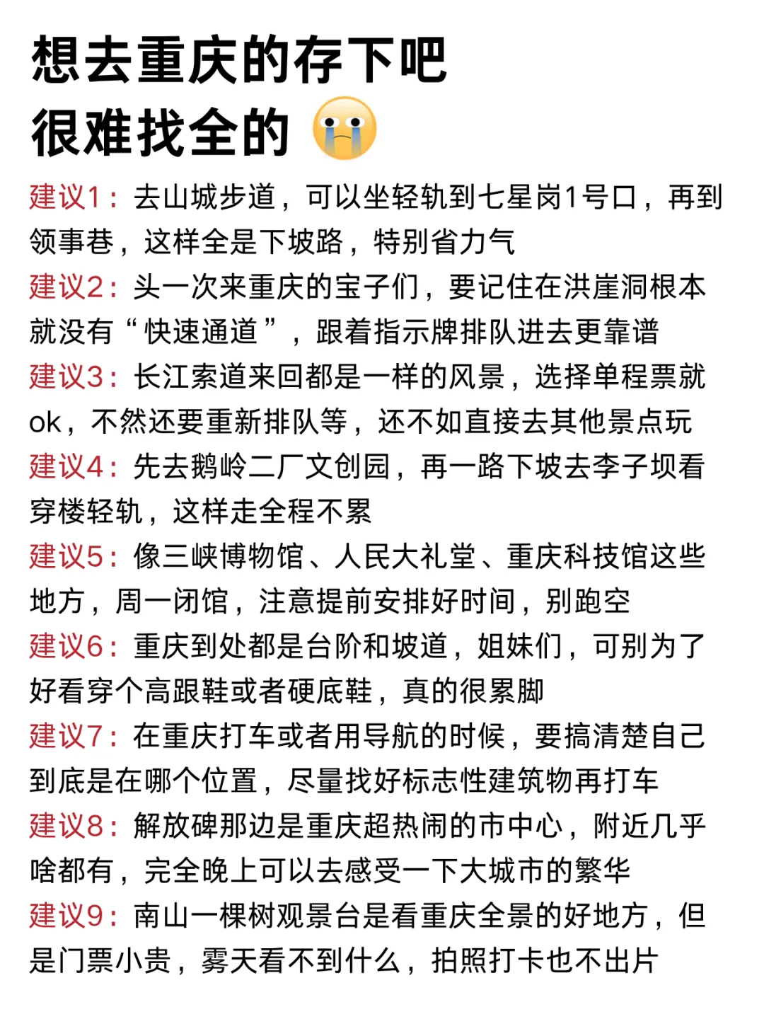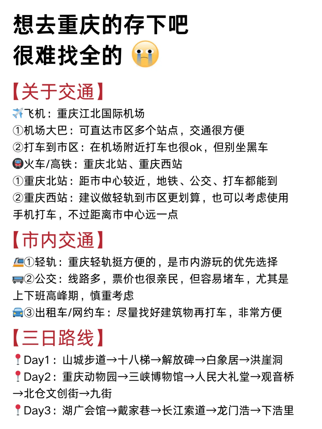 💡刚从重庆回来,用亲身经历给你划重点!11月12月天气转凉,玩法不一样,看完这篇直接抄作业✅ - 📝游玩指南 📍吃完火锅,可以拿出随身携带的关渡调香轻轻一喷,完全能掩盖火锅味,味道清淡又好闻,真的非常适合喜欢香香的姐妹们 📍去山城步道,可以坐轻轨到七星岗1号口,再到领事巷,这样全是下坡路,特别省力气 📍去重庆动物园看大熊猫要赶早,吃竹子、爬树都可好拍了,圆滚滚的大熊猫谁不喜欢 📍不能吃辣的朋友点餐时要留个心眼,尽量选个微辣解解馋,或者直接点个鸳鸯锅 📍头一次来重庆的宝子们,要记住在洪崖洞根本就没有“快速通道”,跟着指示牌排队进去更靠谱 - 🍱重庆美食 🔥烤匠麻辣烤鱼(观音桥大融城店):超好吃的重庆烤鱼,经典麻辣烤鱼+手工黑豆花桌桌都有!还有超适合秋冬吃的芝士烤红薯! 🔥唐红英火锅(临江门店):卤耙鸡爪卤得超软烂,把挑挑牛肉涮一下就好吃得不行!还有毛肚也很nice!是连本地人都经常来吃的重庆火锅! 🔥天棒老火锅:想吃重庆火锅的,可以来尝尝天棒三宝+肥肠炒饭!现切吊龙牛肉口感真的绝了!还有烤苕皮和卤菜系列也很好吃! 更多攻略查看