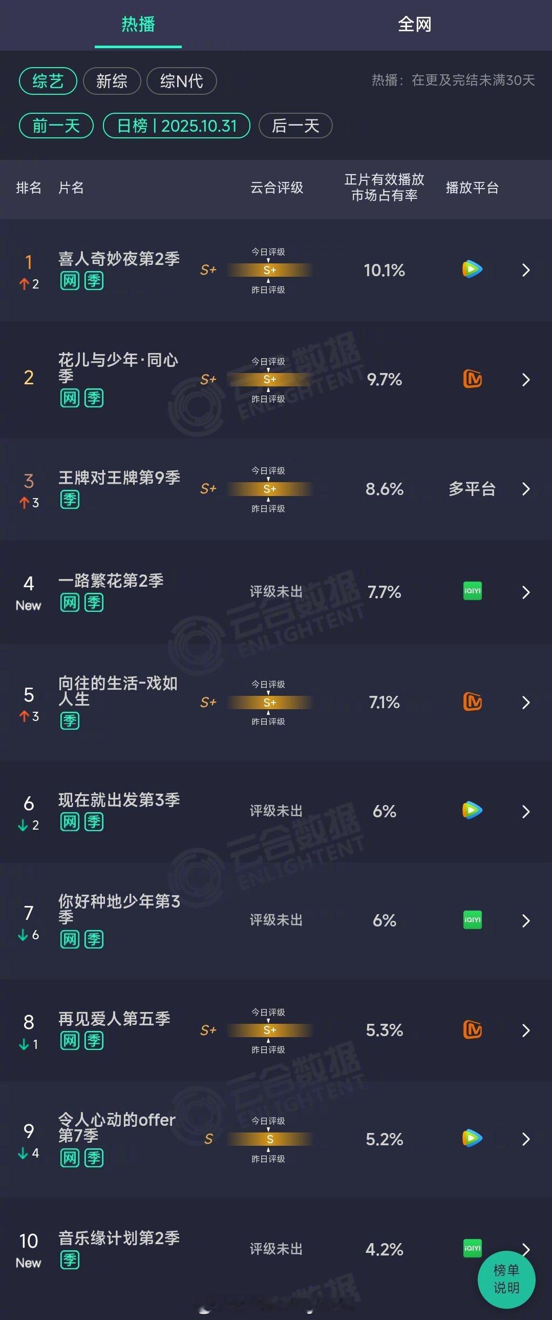 2025年10月31日云合综艺正片有效播放量市占率TOP10