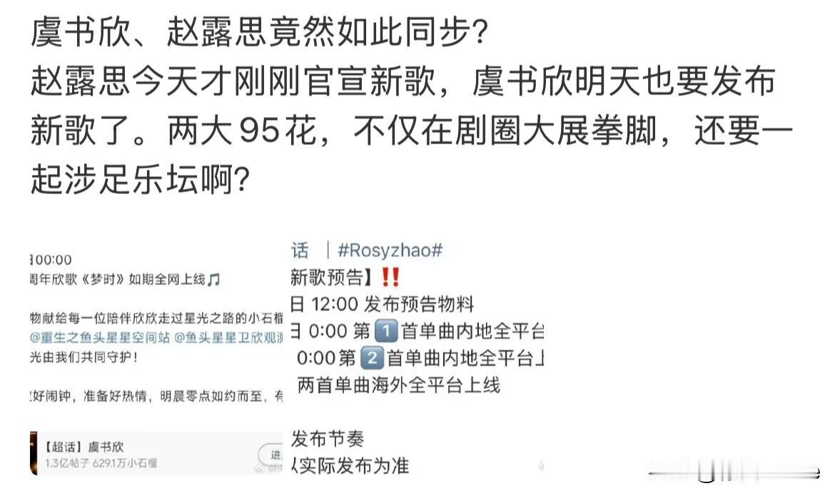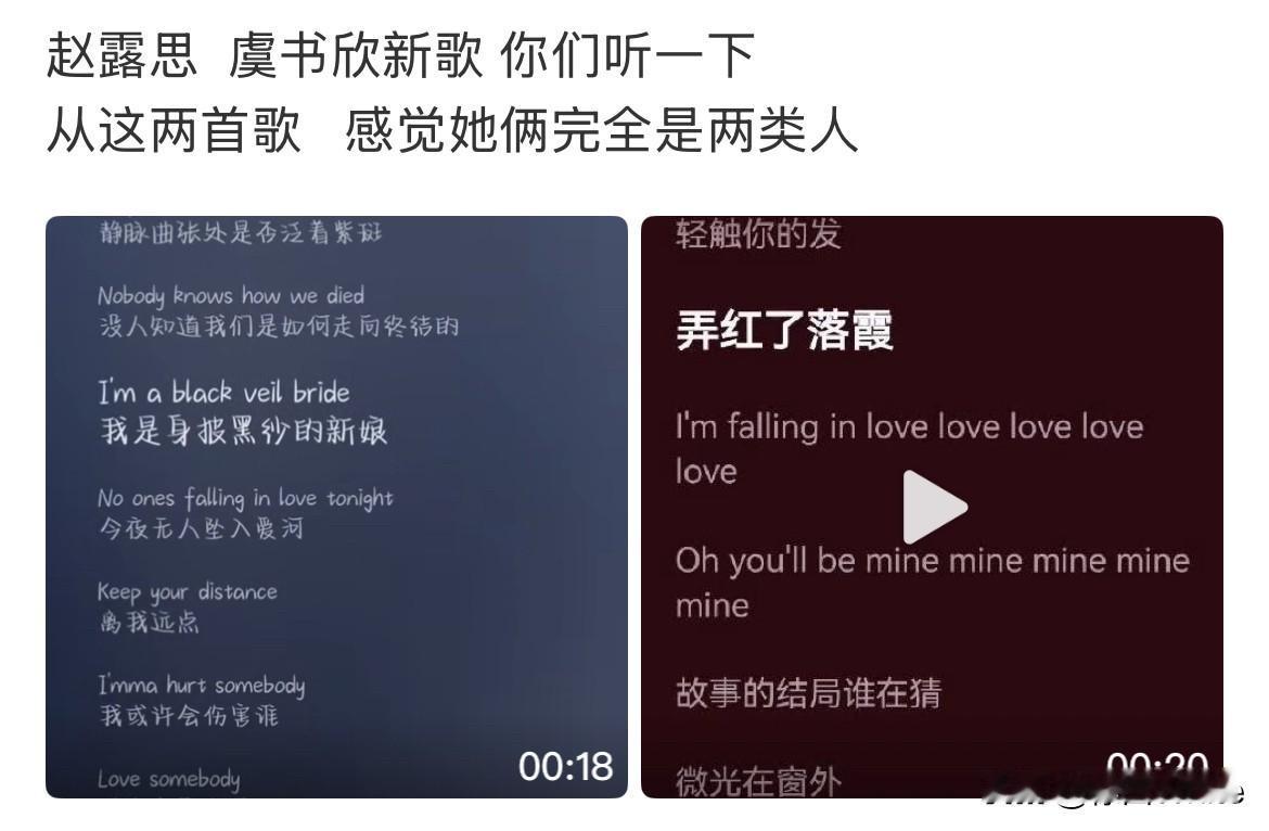 11月1日,赵露思出新歌,原以为会轰动内娱,结果只起了几个水漂,虞书欣也一样! 你出歌,我也出歌,你复出,我也复出,两个本来感觉八杆子打不到的人,偏偏半公开化翻脸了半年,两败俱伤的情况下,赵露思率先突出重围,下个月,下下个月,这两的你来我往故事又讲登上内娱舆论舞台…… 在我看来不如各退一步,从此井水不犯河水,就像当年分崩离析的85花一样…… 对他人冷嘲热讽,最后伤的永远是自己的路人缘!消耗得永远是自己的情绪价值!