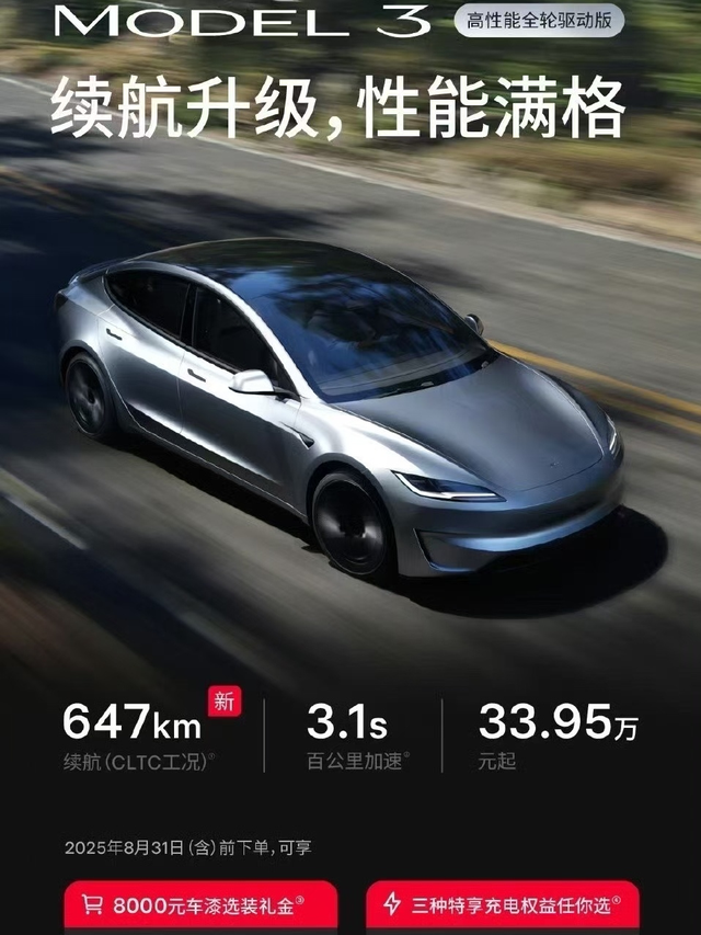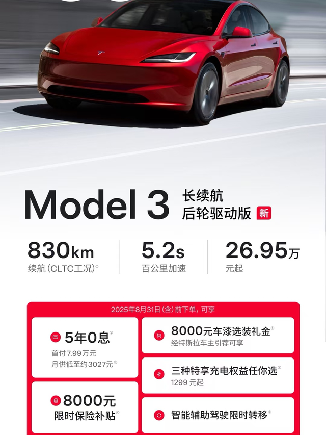 后轮长续航model3值得吗? 特斯拉官网正式上架特斯拉model3后轮驱动长续航版,配78.4kwh LG三元锂电池,CLTC续航830km,价格26.95,比现款长续航全轮驱动版便宜7w,一个电机值7w吗?电池组一样,就差一个电机,那我觉得后轮长续航还是有性价比的。 因为特斯拉不上800V,快充功率又小,长途旅行确实不方便,还是有续航焦虑,这下配了大电池,可以大大缓解续航焦虑,我个人感觉还是可以冲的。