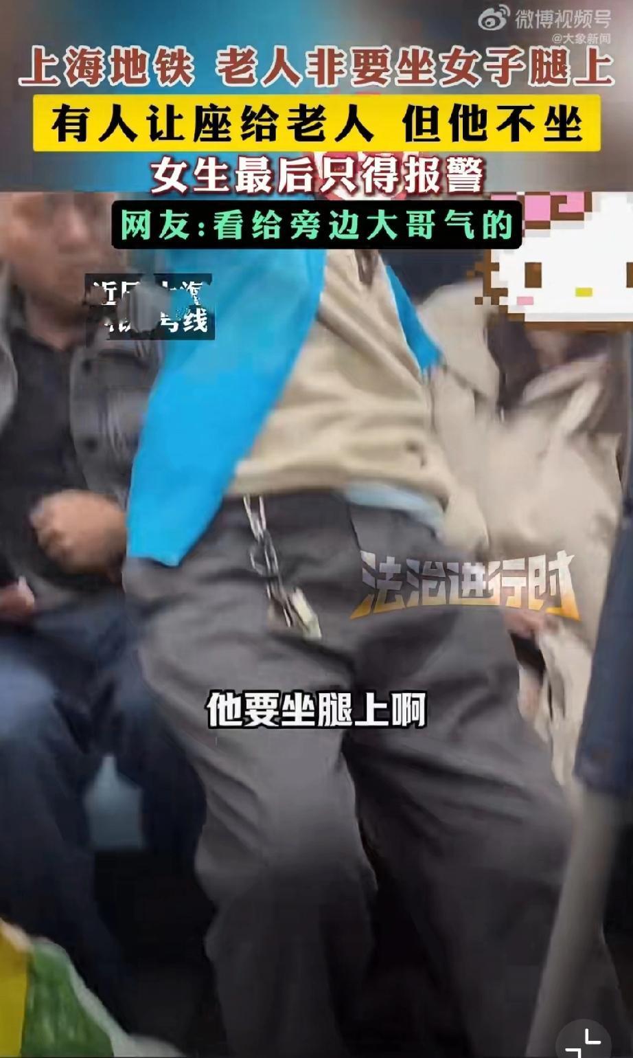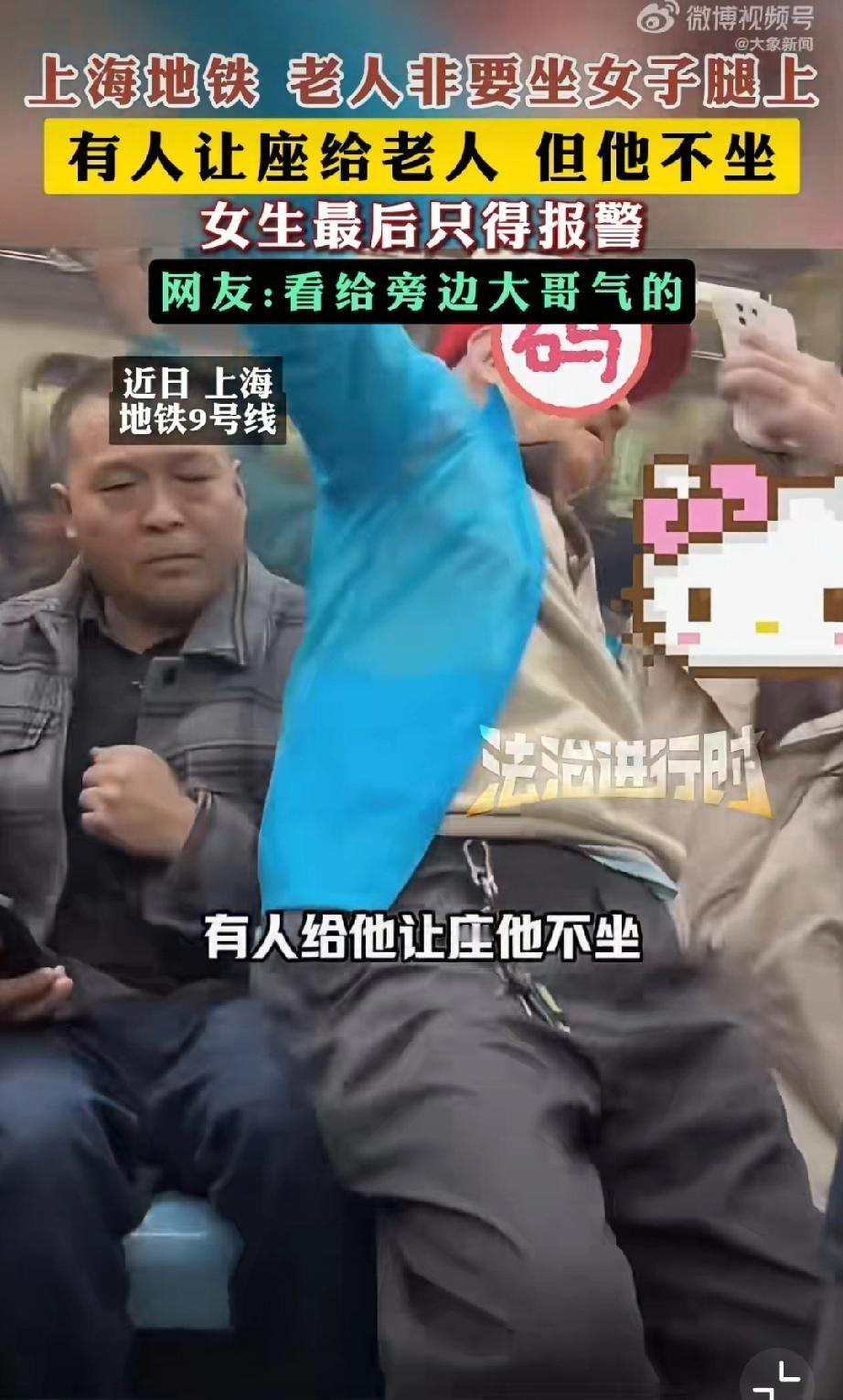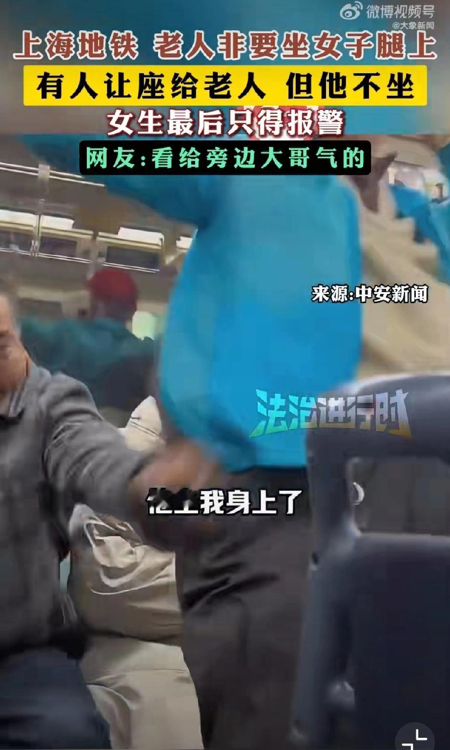 为老不尊!上海地铁上一老人座位不坐,强行要坐在女子腿上,女子无奈选择报警!网友:网友警察别和稀泥,不要惯着老无赖[发怒]!大爷地铁让座 地铁上奇葩行为 地铁老人