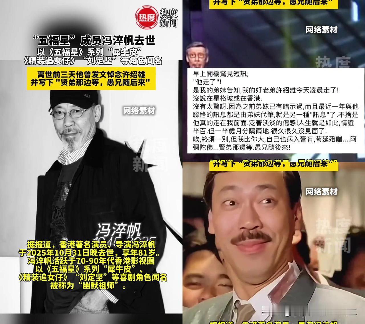 冯淬帆给许绍雄的留言,看完我鼻子瞬间酸了。 10月28日他悼念刚走的许绍雄,写“贤弟那边等,愚兄随后来”,没想到三天后,这句话成了他的遗言。 以前看《五福星》,犀牛皮跟鹧鸪菜抢饭斗嘴,嘴比谁都毒,可朋友有事他第一个冲。 《精装追女仔》里刘定坚追女生,把玫瑰花藏背后都露尖,笑到我拍沙发。 大家留言说“熟悉的脸一个个走,青春快没了”,我突然懂了, 那些边啃零食边看老电影的晚上,正在跟着他们慢慢消失。 你最近一次想起冯淬帆,是翻了《五福星》还是《精装追女仔》? 那些陪你长大的童年熟人,你最舍不得谁?