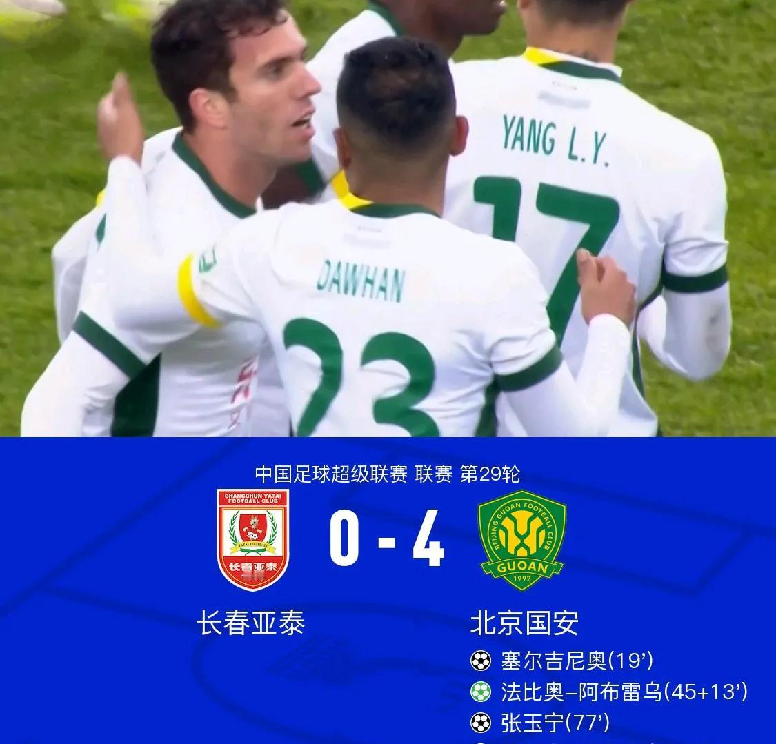 4-0!北京国安队在长春亚泰队终于找到了赢球的感觉。 这场比赛赛前,大家可能都认为长春亚泰队为了保级战意会更足。但没想到,北京国安队这场使出了浑身解数,进攻线多点开花,长春亚泰队完全招架不住,后防线屡屡被打穿,主场的球迷甚至都倒戈喊起了五比零! 这场比赛过后,长春亚泰队基本确认降级了。大家怎么看呢?