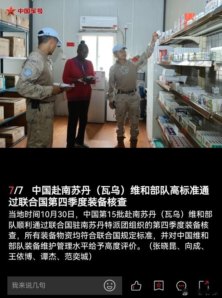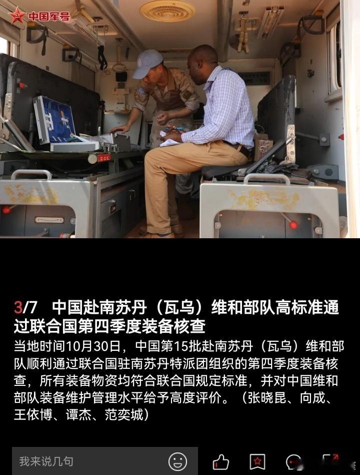 当地时间10月30日,中国第15批赴南苏丹(瓦乌)维和部队顺利通过联合国驻南苏丹特派团组织的第四季度装备核查,所有装备物资均符合联合国规定标准,并对中国维和部队装备维护管理水平给予高度评价。(中国军号)