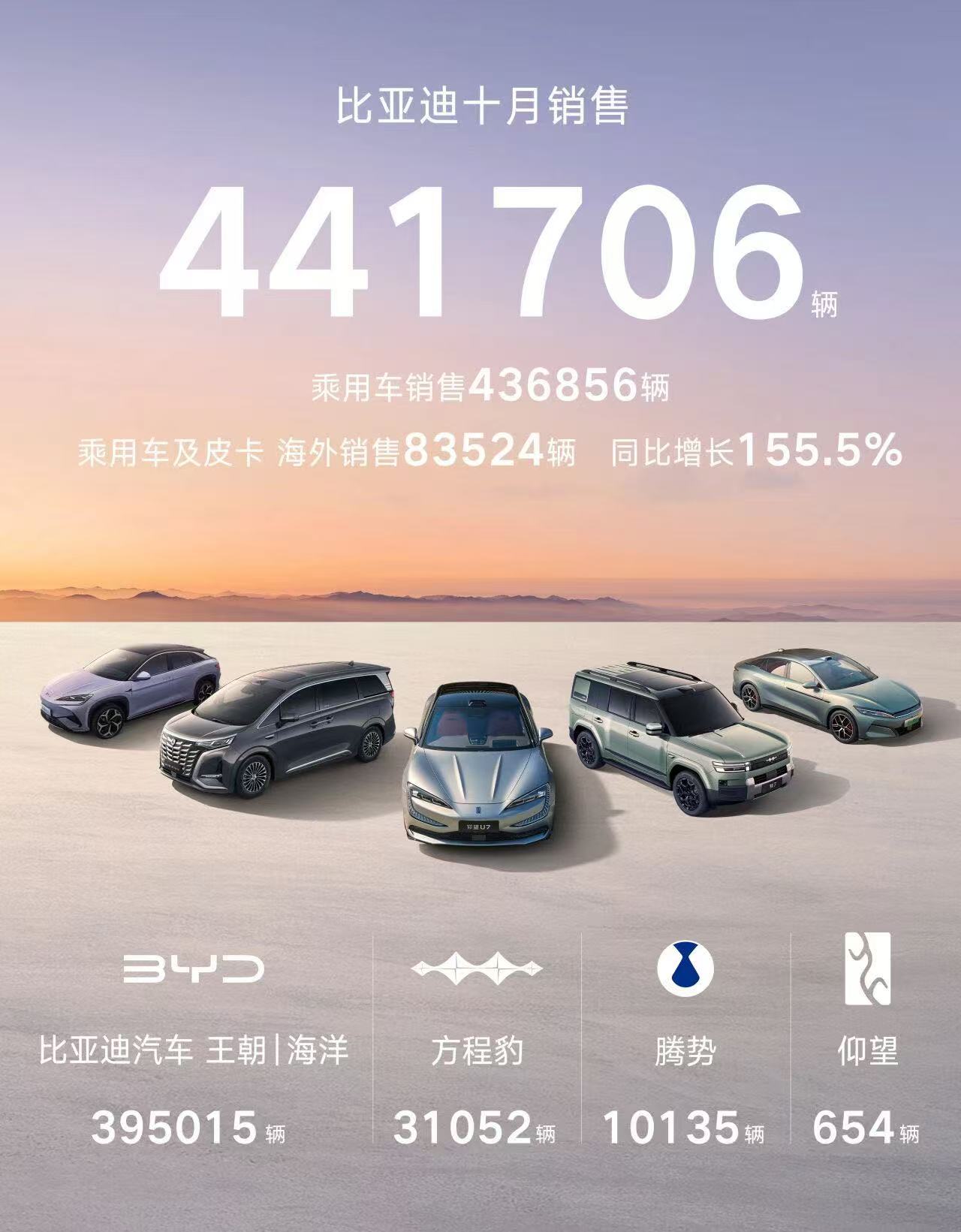 日前,比亚迪官宣:今年前10个月,累计销售超370万辆。其中,10月销售441706辆,创年内新高。具体来看,王朝丨海洋网单月销量达39.5万辆,方程豹单月销量超3.1万辆,腾势单月销量达1.01万辆,仰望单月销量达654辆。值的一提的是,比亚迪海外出口量达8.35万辆,同比增长155%。