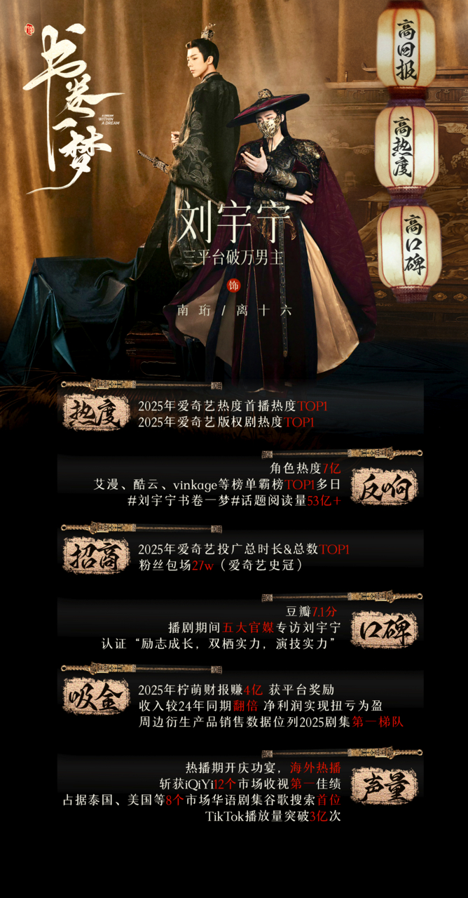 三平台破万男主刘宇宁先以《折腰》《书卷一梦》实现半年双爆,如今又强势解锁闲鱼、碧浪、京东、Olay四大高国民度商务,真正做到海内外大爆、有效播剧👏🏻