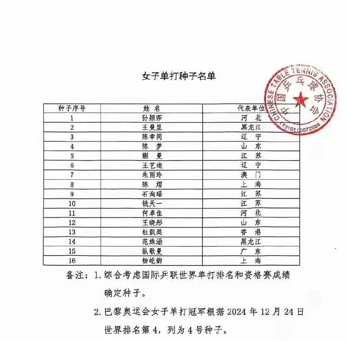 孙颖莎 被列为全运会 女单一号种子选手! 这是日前 中国乒协新发布的 消息; 这个排位 是根据 国际乒联 最新世界排名 包括资格赛 成绩最终确定; 近年以来, 已取得两届 世乒赛单打冠军、 两届世界杯 单打冠军; 是现役国乒女队 三大赛 成绩最出色的 运动员; 世界排名第一; 无疑, 她也是 本届赛事, 女单冠军的 最有力争夺者之一!