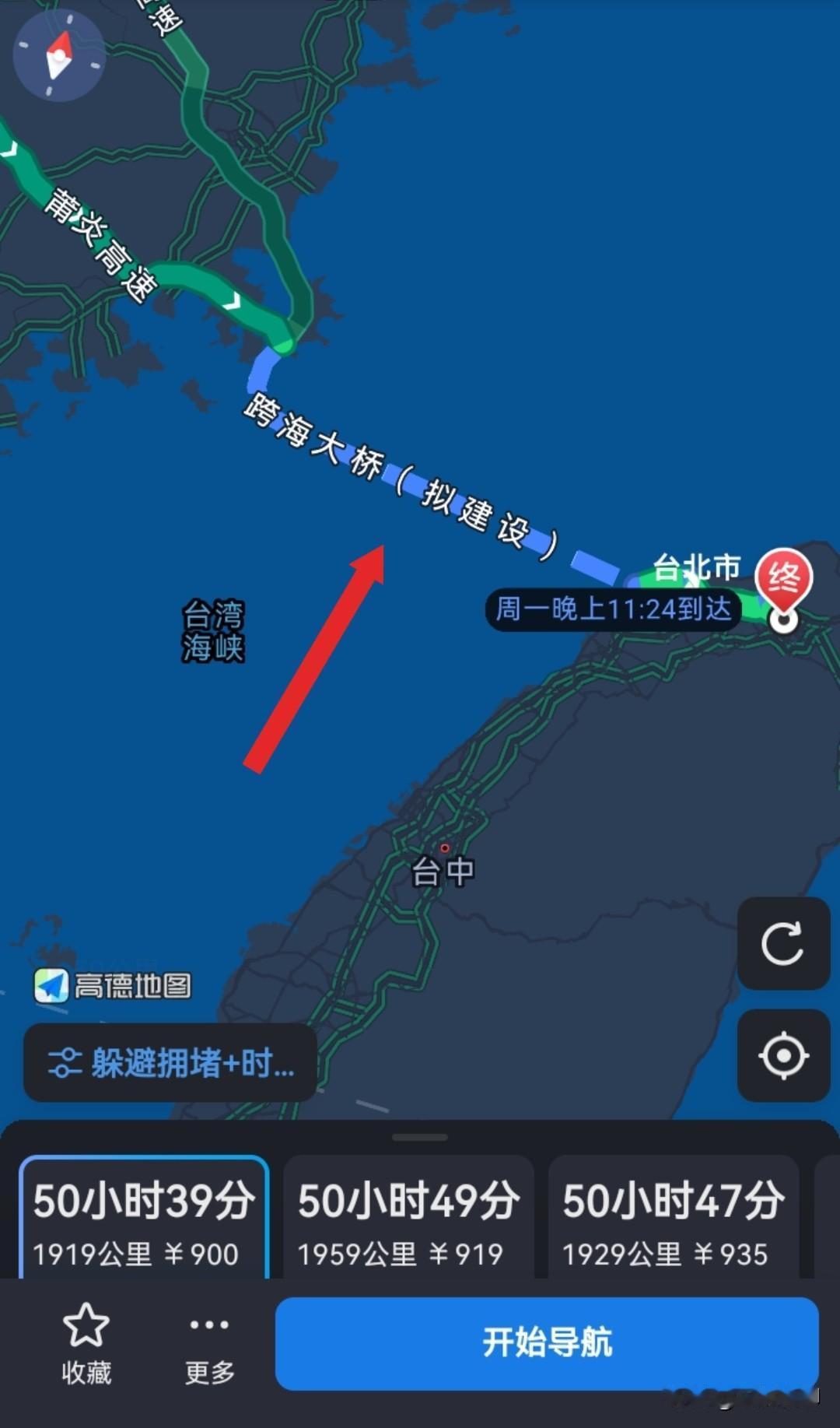 真是太神奇了!大家知道吗?如今用高德地图导航去台北,竟能直接规划路线并显示预估时间,汽车可先开到福建平潭,再通过建设中的跨海大桥直达台北。看来咱们对台统一工作正在稳步推进,地图导航已然先行跟进,在建的这座跨海大桥未来也必将落成,看着着实令人振奋! 高德地图 台湾地图 台湾省地图标注 台北 台湾卫星地图 平潭岛自驾 平潭自驾游路线