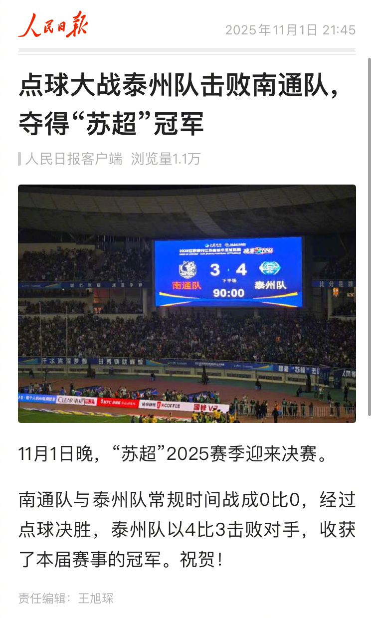 【点球大战泰州队击败南通队,夺得“苏超”冠军】11月1日晚,“苏超”2025赛季迎来决赛。南通队与泰州队常规时间战成0比0,经过点球决胜,泰州队以4比3击败对手,收获了本届赛事的冠军。祝贺!(人民日报客户端)