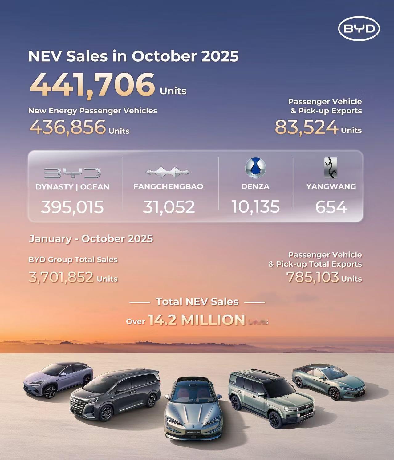 10月,比亚迪乘用车和皮卡出口8.3万辆。