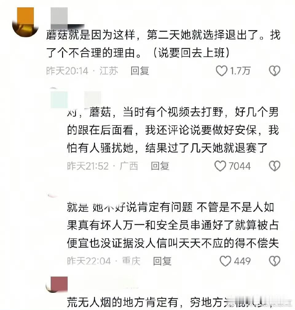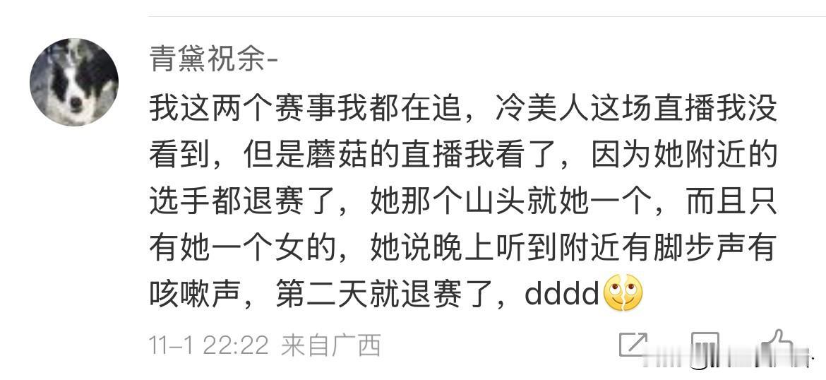 冷美人你退赛吧 不是因为怕你坚持不住,也不是不希望你赢。 而是因为比起赢得比赛,你的安全更重要! 冷美人是这场荒野求生比赛中剩下的唯一一名女选手,但就在前两天深夜,她在庇护所休息时,察觉到有人摸黑靠近!!! 还好因为她睡眠较浅及时惊醒,未发生进一步危险。 而之前另一位女选手也因为差不多的原因退赛! 可见这种危险真实存在。 虽然现在主办安排安全员在其庇护所附近蹲守,允许她携带刀具防身,同时开通紧急哨子求助通道,明确吹哨求救不算违规。 但人心难测,而且她现在也出名了,真不如退出算了! 荒野求生女选手