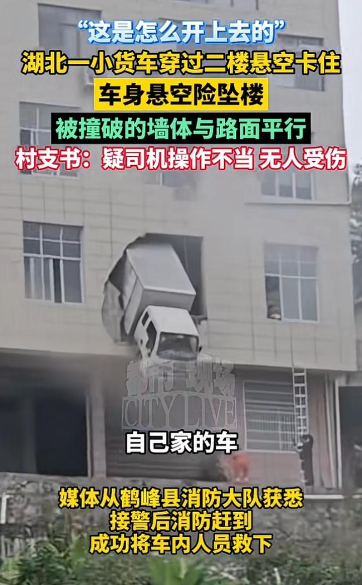 湖北恩施出人才,一辆小型货车从自己家的大门开到了房间的后窗户上,索性司机及时踩下了刹车,没有冲到后面的菜地里,可悬在二楼的位置他也不敢动,直到消防员赶到后才把他从驾驶位上救下来,此时他双脚已经麻木,非常哆嗦的跟消防员说谢谢。 据村支书介绍:窗户撞坏的房子是他自己的,货车也是他自己,没有人员受伤,可能是操作不当速度太快一时没刹住车,也有可能是把油门当刹车踩了,不管怎样也算是虚惊一场,只要人没事其它的都好说。