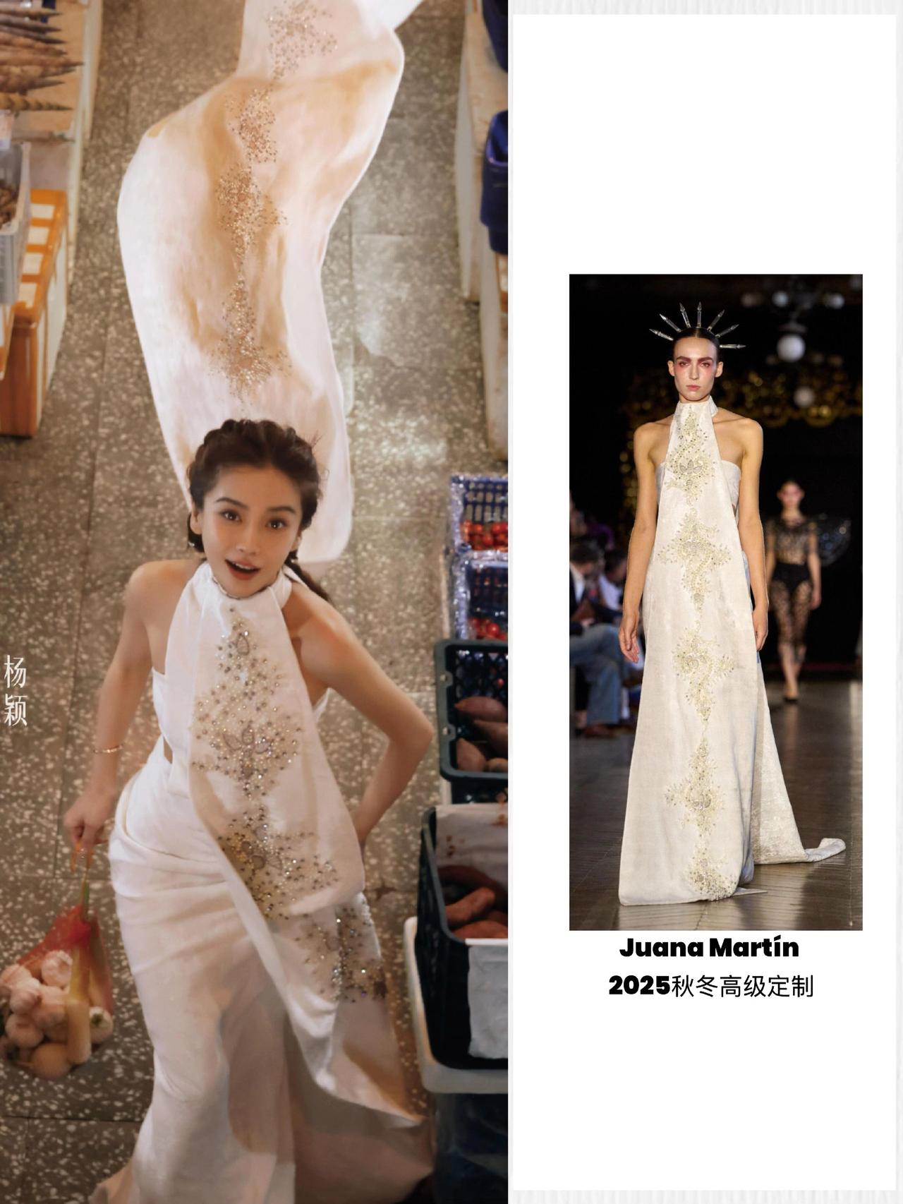 杨颖这波“高定下凡”太会玩了!把Juana Martin、Yanina等4套顶奢高定,直接搬进菜市场、裁缝铺,白钻裙拎菜篮、绿缎裙抱蔬菜、斑马纹裙站杂货铺… 秀场的华丽和生活场景撞出反差萌,把“贵气”和“接地气”焊成了喜剧感穿搭范本~杨颖