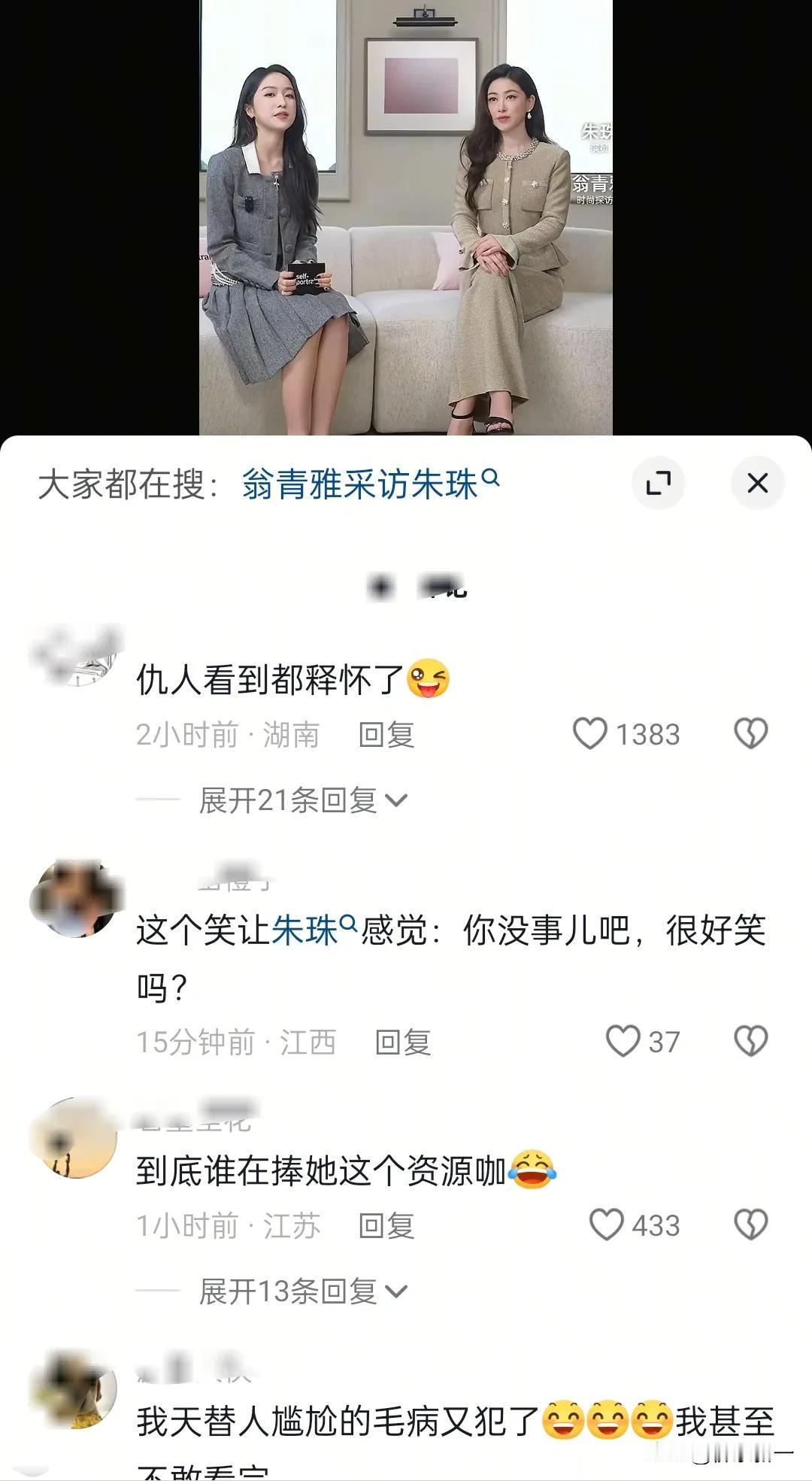 救命,以为心动信号没乐子了 结果翁青雅采访朱珠的一个片段给我尬到不行,没有硬实力怎么敢学乐言做主持串场的啊! 进门不关门,让作为采访嘉宾的朱珠以为后面还有人进,但其实没有,又让朱珠作为客人关门。 以为只是她没注意到这些职场礼仪罢了,结果她一采访一开口就磕磕巴巴的不行了,一句“很高兴能请到朱珠这样的独立而温柔的女性来到现场”,竟然磕巴了四次[捂脸] 也不怪奥斯卡不选翁青雅了,这是肚子里没一点墨水的富家女啊,完全不如大女主乐言一点! 当初不看好现在都看好他们俩了,还是势均力敌的情侣更登对。 这段采访最受折磨的应该也是朱珠了! 网友都在调侃仇人看到都释怀了!