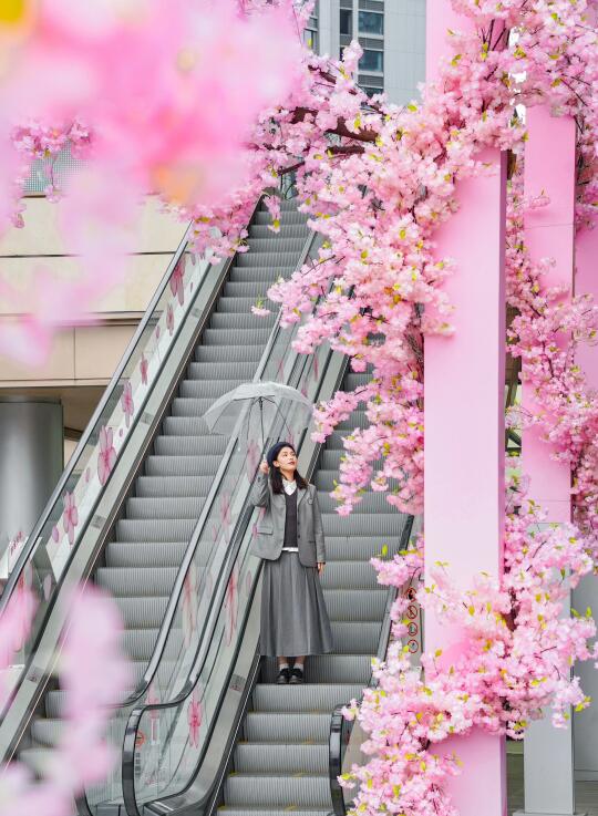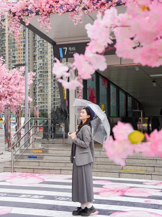 成都的!开满粉樱的扶梯!!3.6日实拍! 7号线地铁直达!!!一出地铁就是!! 满屏樱花映入眼帘!真的太太太太浪漫了!!! 关键下雨都这么好看🥹谁懂啊!! 蹲一个成都大晴天!!!
