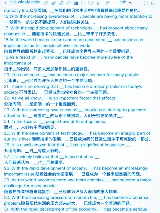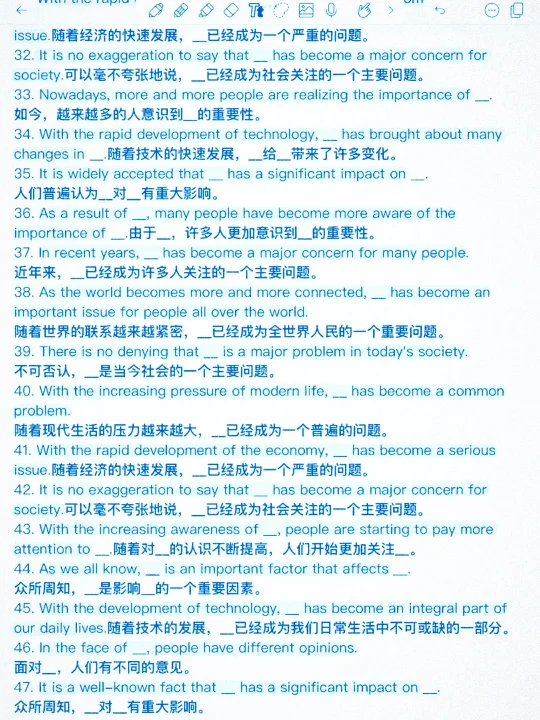 万能句型英语作文1🌸 1. I will conclude by saying... 最后我要说…... 2. It goes without saying that... 不言而喻,...... 3. It can be said with certainty that...可以肯定地说...... 4. As the proverb says,正如谚语所说的, 5. It has to be noticed that...必须注意到,...... 6. Its generally recognized that... 普遍认为...... 7. What calls for special attention is that... 需要特别注意的是...... 8. Theres no denying the fact that... 不可否认...... 9. Nothing is more important than the fact that...没有什么比......更重要 10.Today, ..., which have brought a lot of harms in our daily life. First, ... Second, ... What makes things worse is that... 现在,……,它们给我们的日常生活带来了许多危害。首先,……;其次,……更为糟糕的是…… 万能句型英语作文2🌸 …………………………… 英语 学英语 英语学习 零基础英语 每日英语 英语笔记 英语美文 英语作文 英语读后续写 高考英语作文 作文