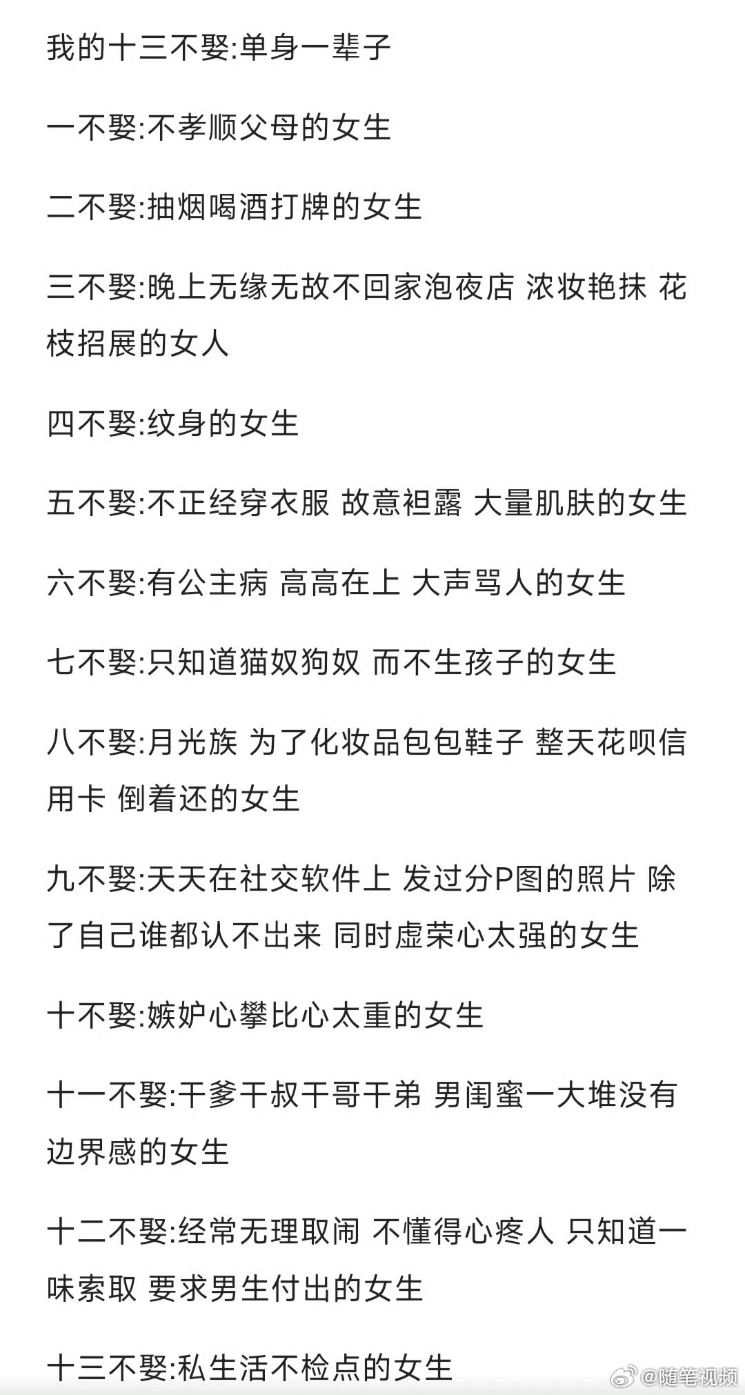 有位小伙子提出了以下的十三不娶,结果引来网上骂声一片,你觉得他的要求过分吗?