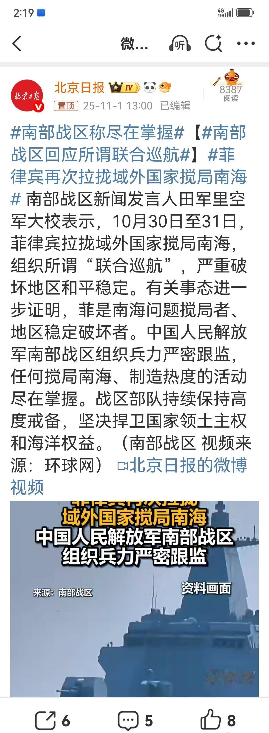 南部战区回应所谓联合巡航菲再拉外援秀肌肉,无非把南海当秀场;解放军一句“尽在掌握”,是定海神针也是警钟——想借外力碰瓷,先掂量域内大国的雷达与舰机。搅局者赚不来选票,只配当靶标。和平不是独白,高度戒备才是真话。闲云杂谈