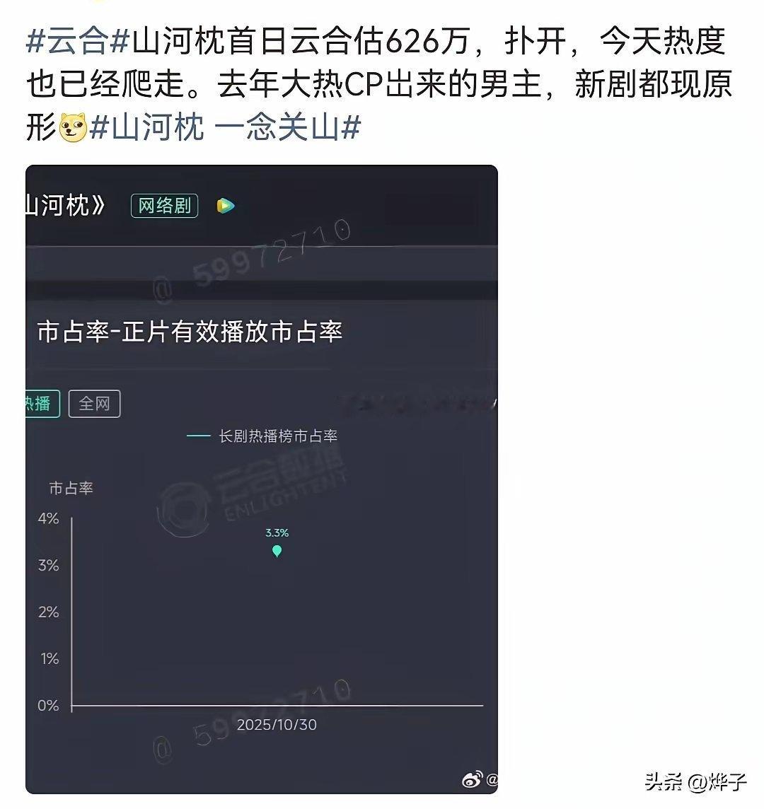 从《永夜星河》爆出来的丁禹兮,流量要比李昀锐强很多,但他最近的新剧《山河枕》首日云合播放量估值仅有626万,第二日热度也没有突破24000,最终成绩可能比不过李昀锐的《宴遇永安》。