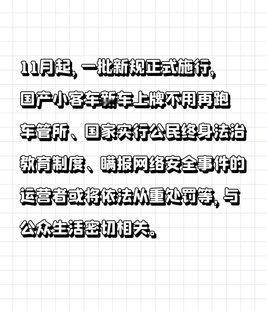 11月起,一批新规如同“贴心小管家”正式上岗啦!国产小客车新车上牌不用再像无头苍蝇似的往车管所跑、国家实行公民终身法治教育制度、瞒报网络安全事件的运营者或将依法从重处罚等,这些可都和咱老百姓的生活紧紧绑在一起呢。