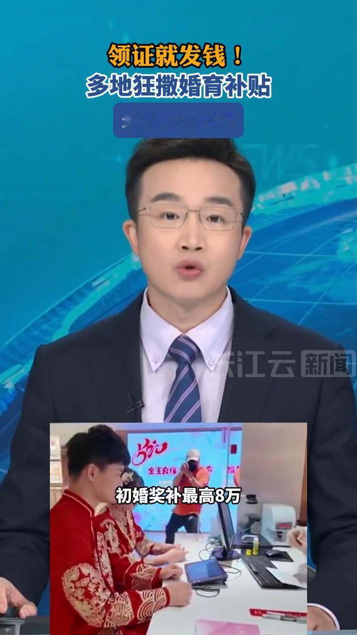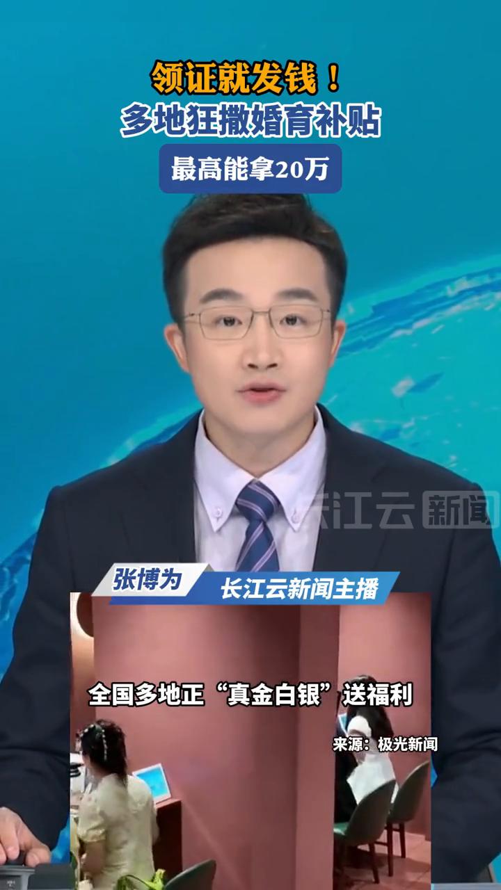 领证就发钱!多地狂撒婚育补贴,最高能拿20万。 张博为,长江云新闻主播。 准备结婚的朋友们,好消息来了!全国多地正"真金白银"送福利,领证就能领补贴,最高居然能拿20万。 ·浙江动作最大,宁波、杭州、绍兴、柯桥都发千元结婚消费券,能抵婚纱摄影、婚宴酒店的开销。 ·山西吕梁更加的直接,符合条件的新人领证当场就能领1500元现金红包。 ·最"硬核"的是广州南岭村,初婚奖补最高8万,加上生育补贴合计20万。 这些政策不光帮新人减负,还能激活"甜蜜经济"。您觉得这波福利实在吗?