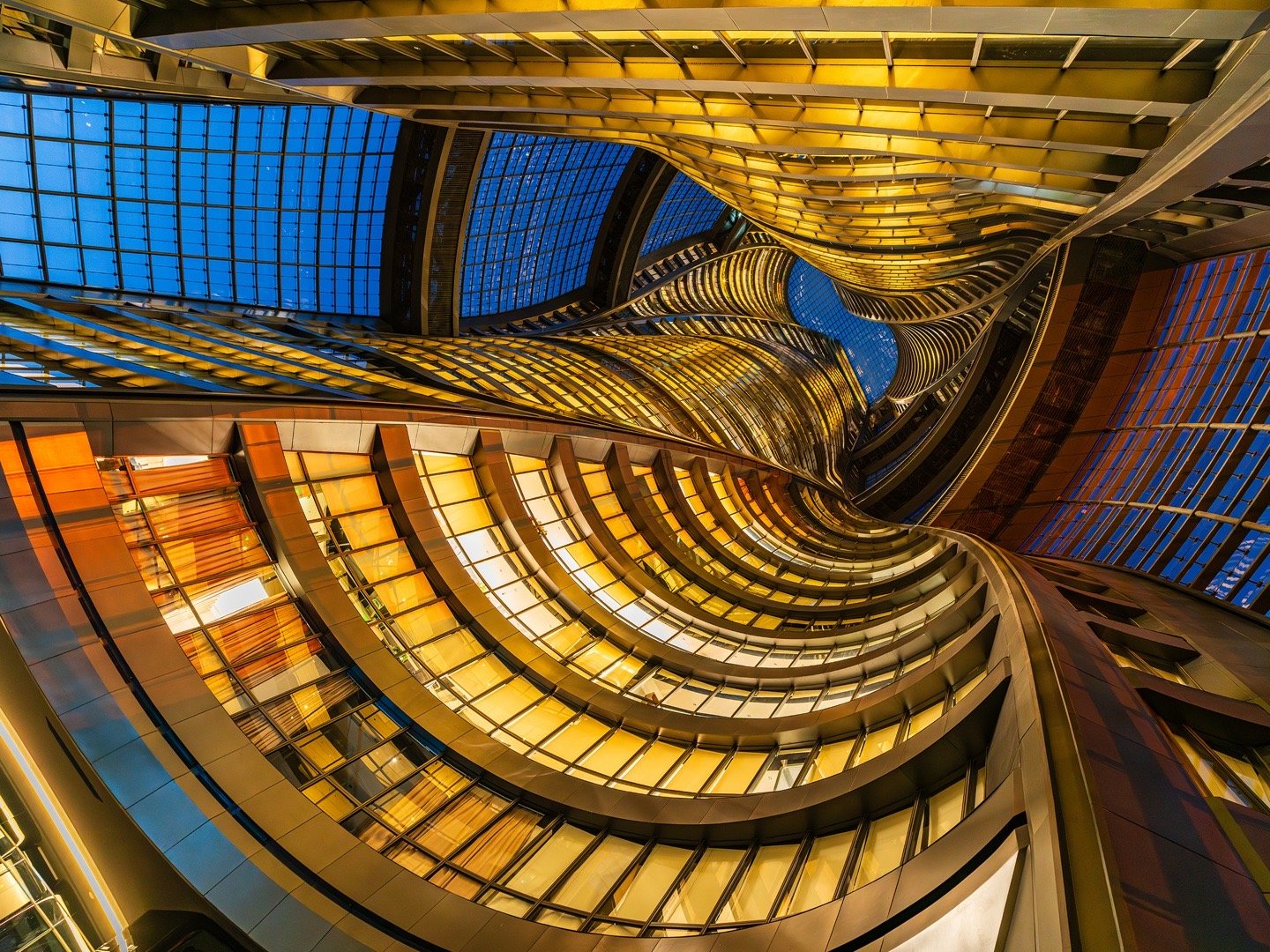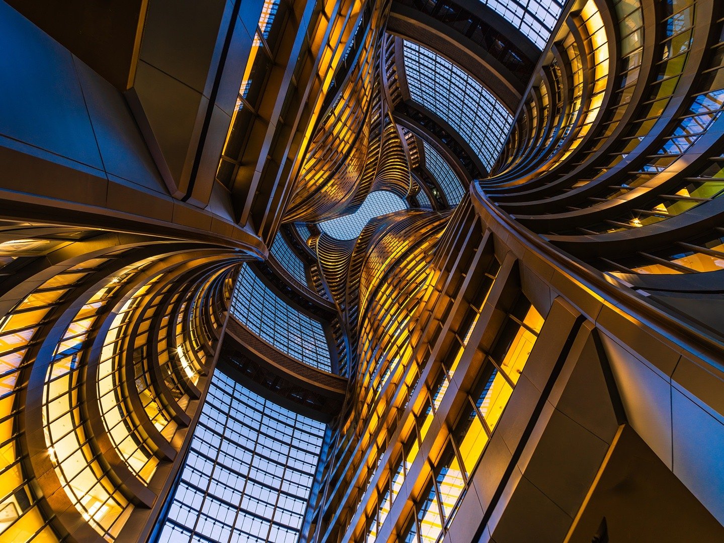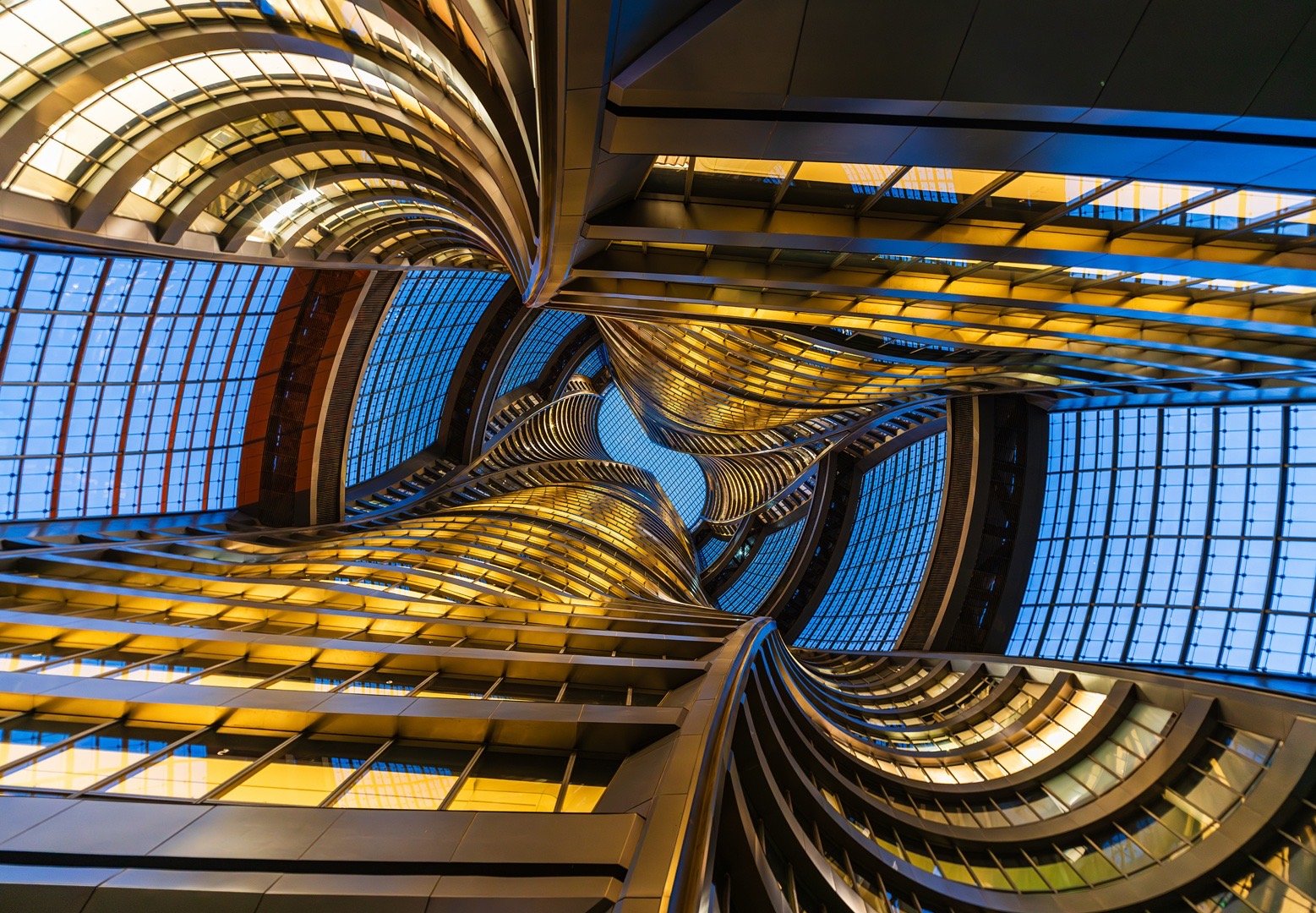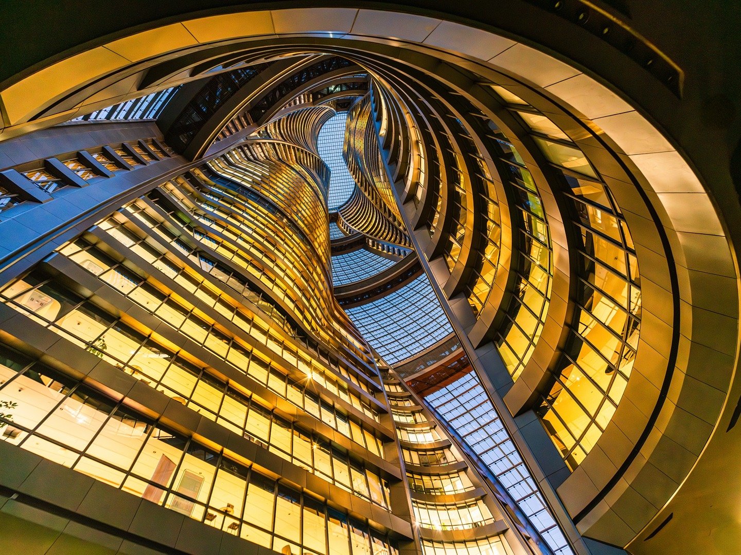北京丽泽SOHO,拍摄友好,周末无人,傍晚天空蓝调。螺旋般的空间如时空隧道,每一处曲线都是神来之笔,每一束光影都是极致表达。ISO1600,手持一秒曝光。哈苏X2DII防抖牛,20-35镜头。