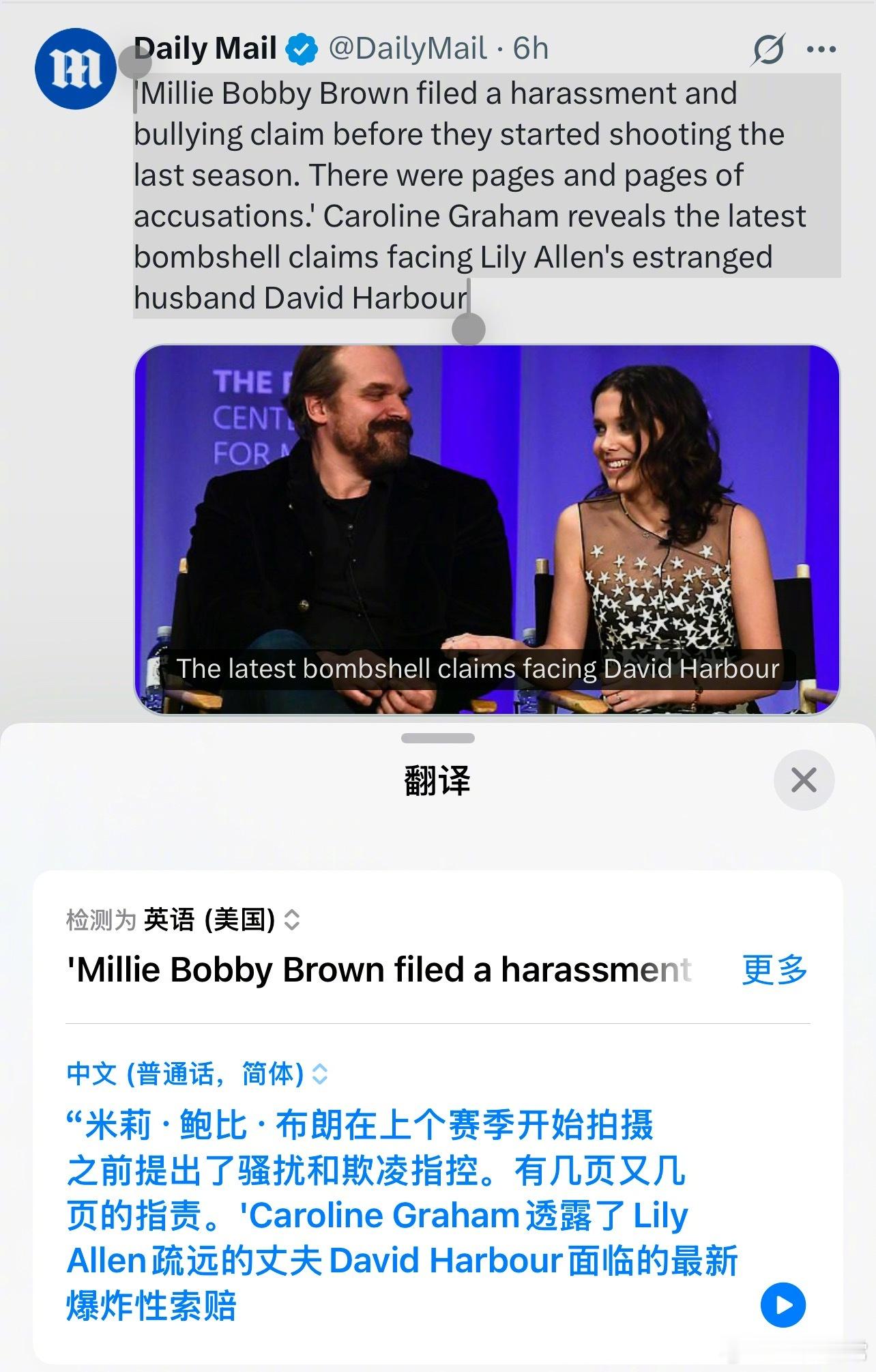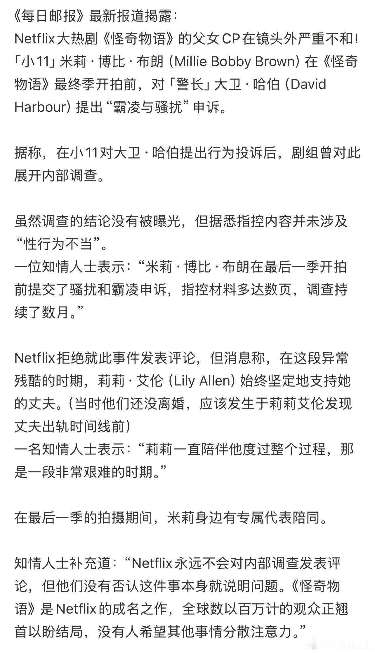 《怪奇物语》“小11”米莉·波比·布朗对霍普警长的扮演者大卫·哈伯提出霸凌与骚扰申诉