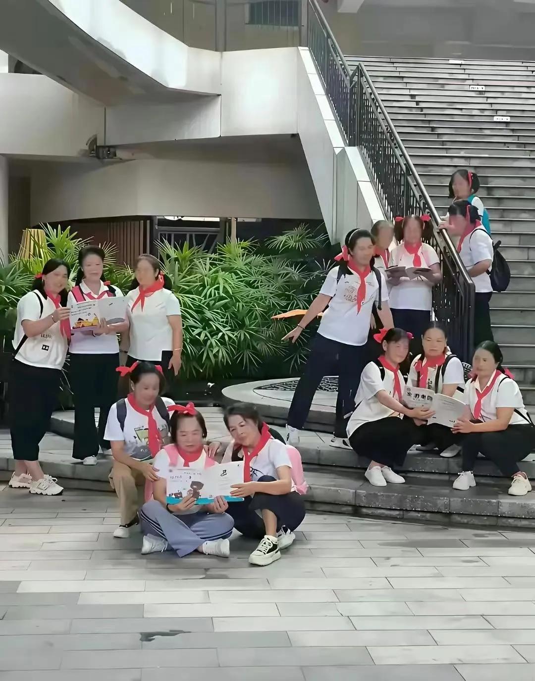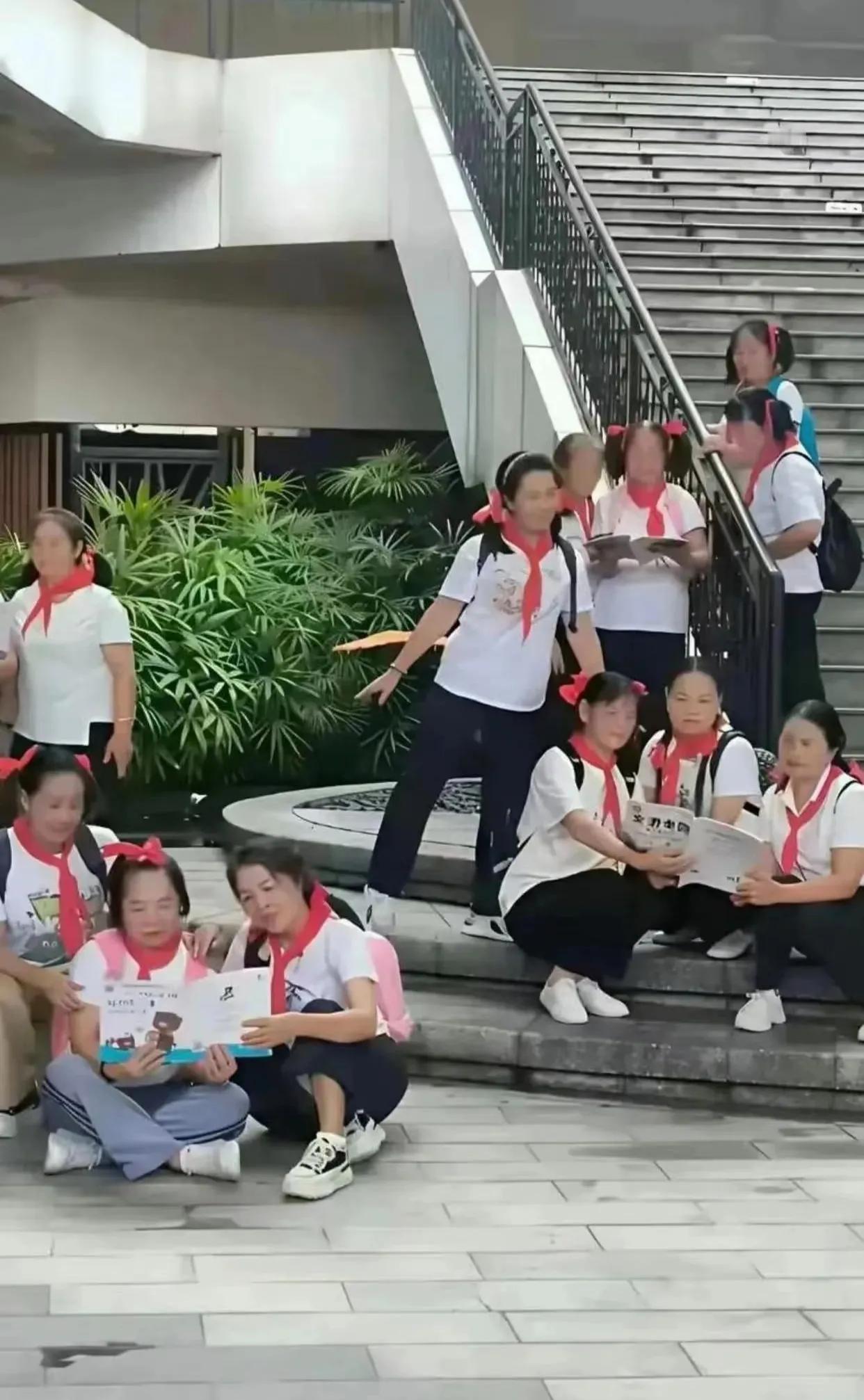 一群大妈穿上校服戴着红领巾,体验一把回到童年的快乐时光!