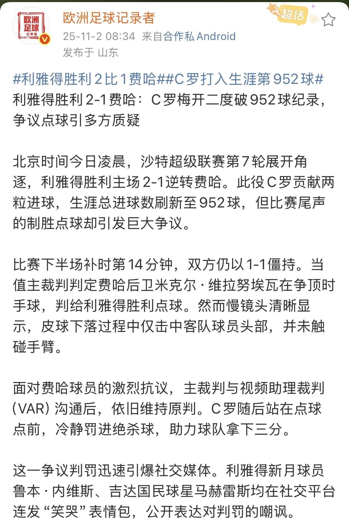 利雅得胜利主场迎战费哈。C罗攻入扳平一球,1:1的比分维持到90分钟。裁判居然给了十几分钟的补时,以助主队再进一球。眼看不行了,在补时的第14分钟,主裁判判定费哈后卫在争顶时手球,判给利雅得胜利点球。然而慢镜头清晰显示,皮球在下落过程中仅击中客队球员头部,并未触碰手臂。 面对费哈球员的激烈抗议,主裁判与视频助理裁判(VAR)沟通后,依旧维持原判。C罗随后罚进绝杀球。 有沙漠干爹爹们保送,最多的抗议也是无用。