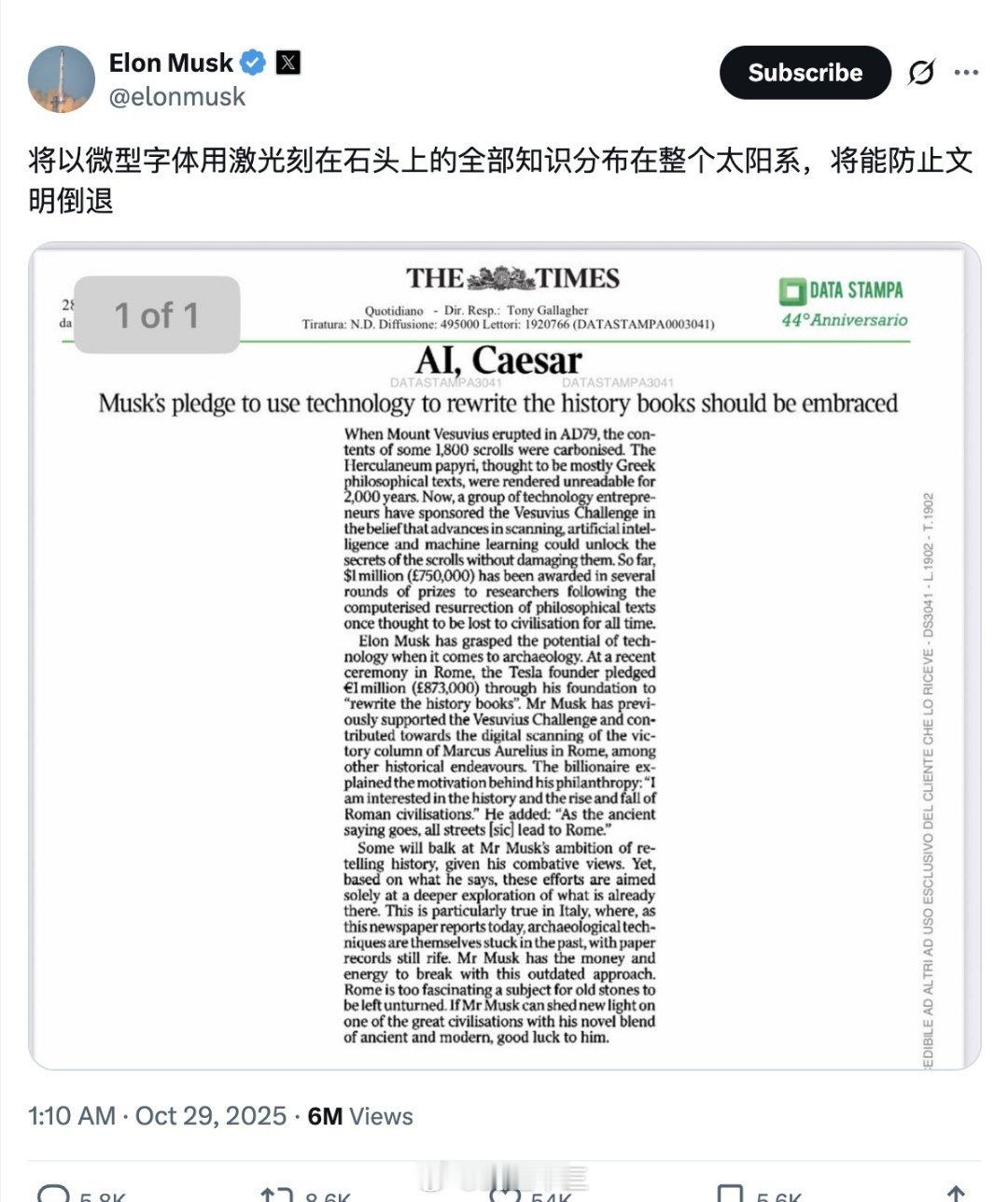 真的好有钱,才能思考如此高纬问题。马斯克最新推文:将以微型字体用激光刻在石头上的全部知识分布在整个太阳系,将能防止文明倒退。 ​​​