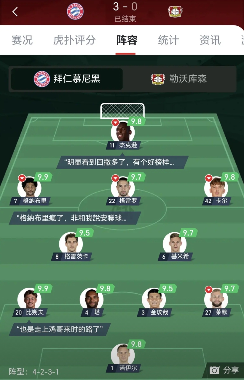 今年德甲已经大结局了,拜仁在德甲踢谁都是踢人机,连替补都全面压制药厂。 目前已经15连胜了,这么下去,搞不好这赛季拜仁会34连胜夺冠! 现在德甲冠军是5大联赛最没悬念的,对手没一个能打的,拜仁每场比赛就像砍瓜切菜一样简单。 我是真没想到,这场拜仁也就基米希、格纳布里、莱默、塔四个主力啊,这都能赢3:0,可见药厂欧冠被虐不是没有道理的。 这赛季拜仁最大的发现就是小将卡尔,这小孩技术比当年克罗斯还要好,而且盘带能力比克罗斯强,才17岁,前途无量啊。