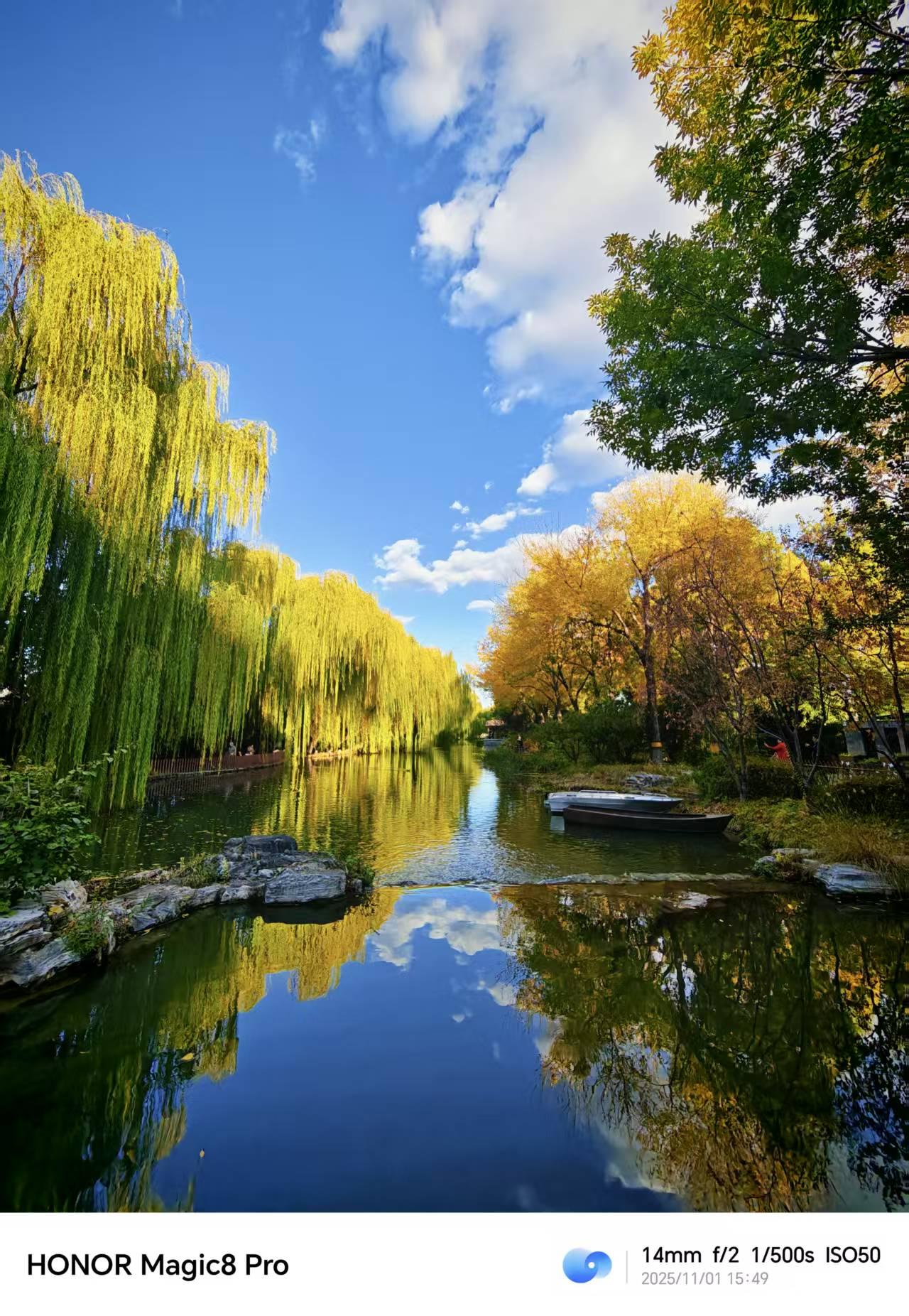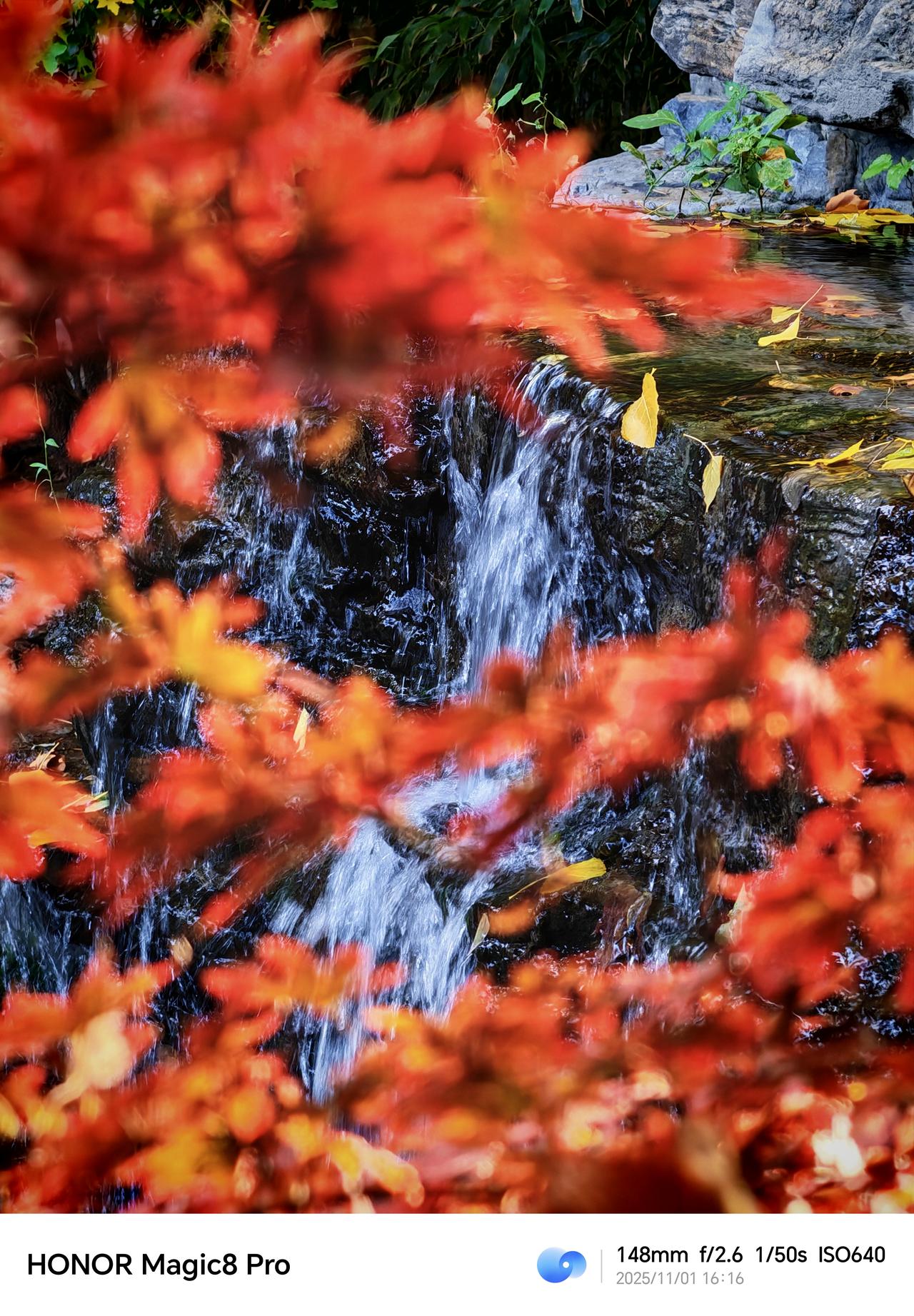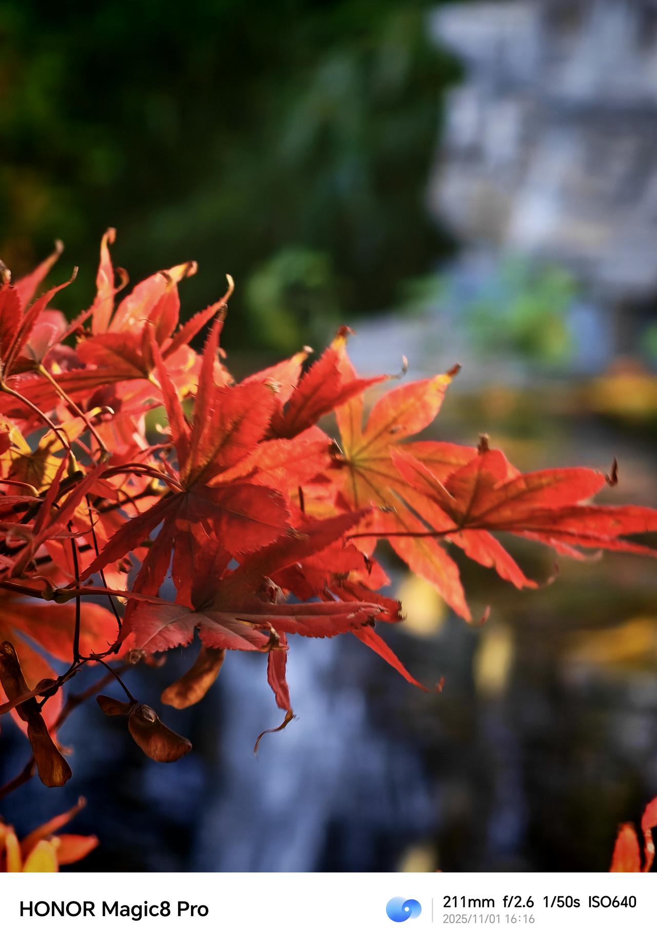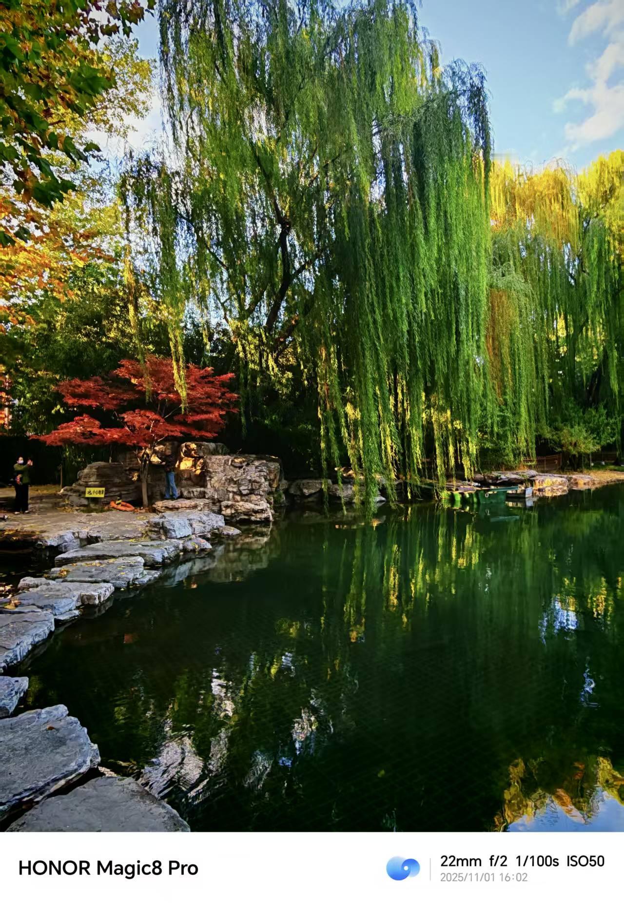 北京的秋,在园林的一潭碧水、枫叶的一抹艳红里。用荣耀Magic8 Pro记录下这份景致,倒有了些意思。秋天氛围感图片 园林水畔,垂柳依旧带些绿意,与石径、红枫相映成趣。镜头里的画面层次分明,水的澄澈、树的斑斓都如实呈现,倒像是把这处小景的清幽都框了进来。 凑近看枫叶,叶片的红得浓郁,脉络清晰,背景的绿意也柔和地晕开。长焦的表现让细节尽现,秋的热烈就这么被捕捉到了。 北京的秋景本就韵味十足,有个趁手的设备,便能把这些瞬间留住。