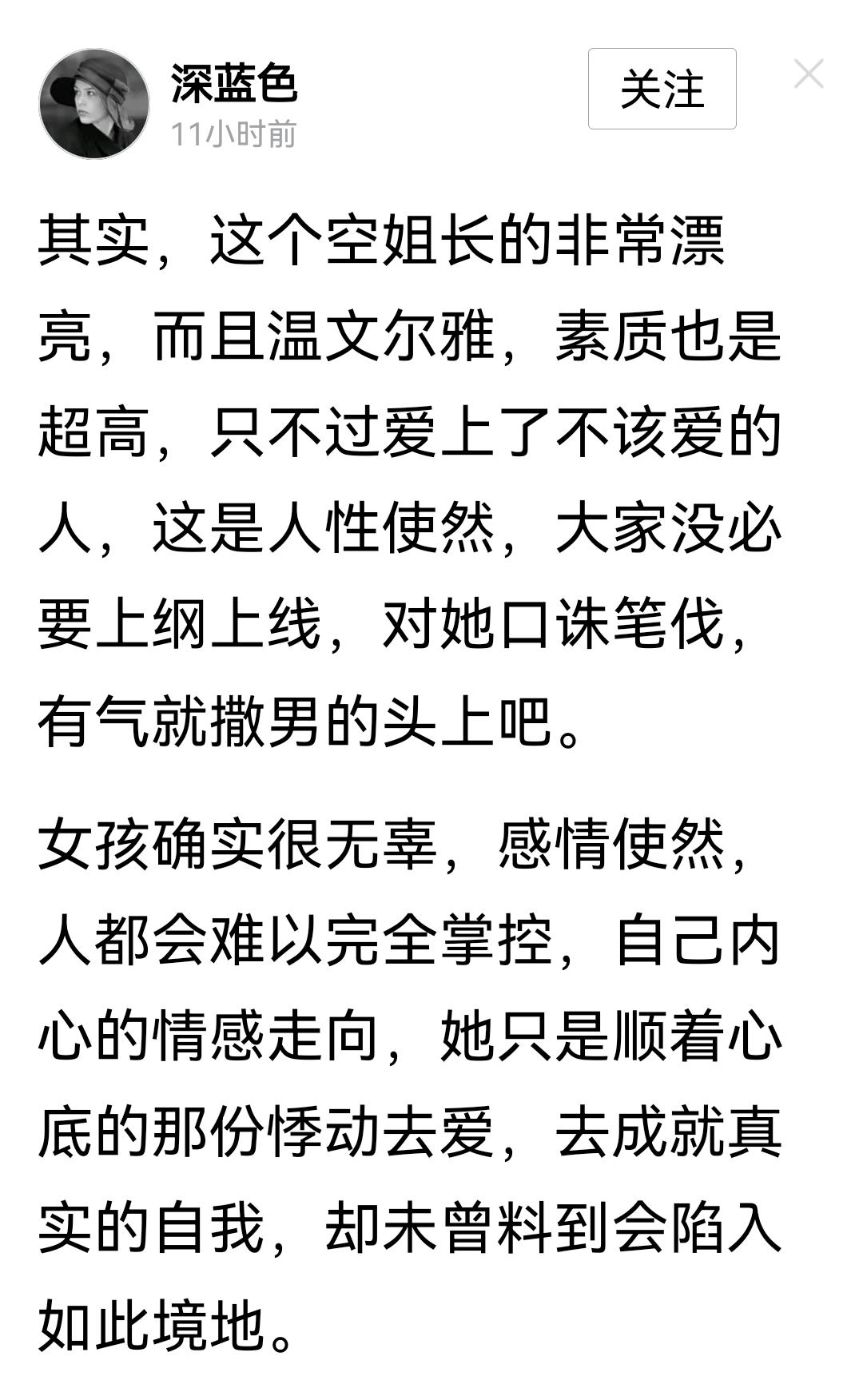 现在的人真是有意思 居然同情知三当三的人 空姐虽然貌美 但是素质高? 素质高的人会当三? 会破坏别人的家庭? 怪不得世风如下 有这么多不明事非的人 空姐职业素养 知三做三