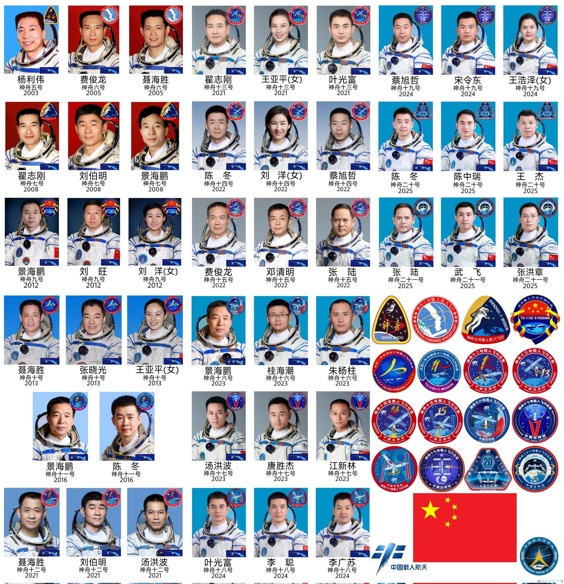 分别是第一批9人;杨利伟 翟志刚 景海鹏 费俊龙 聂海胜 刘伯明 刘旺 张晓光 邓清明